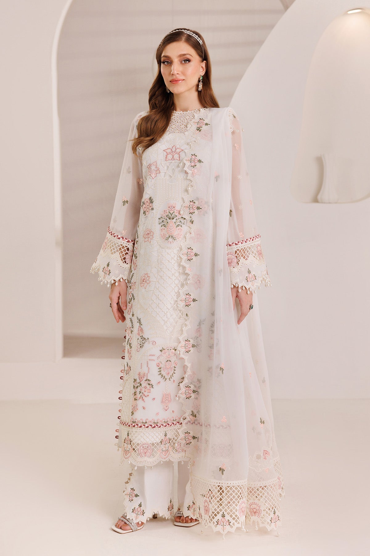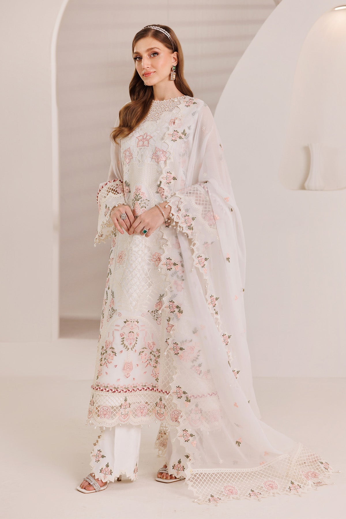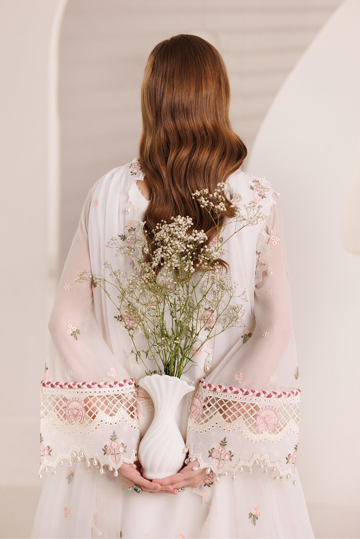 This soft white chiffon shirt features delicate floral embroidery and intricate threadwork, adding a unique and refined touch. Paired with raw silk trousers and an embroidered chiffon dupatta, the ensemble effortlessly blends elegance with cultural charm.