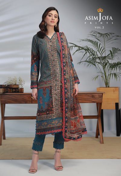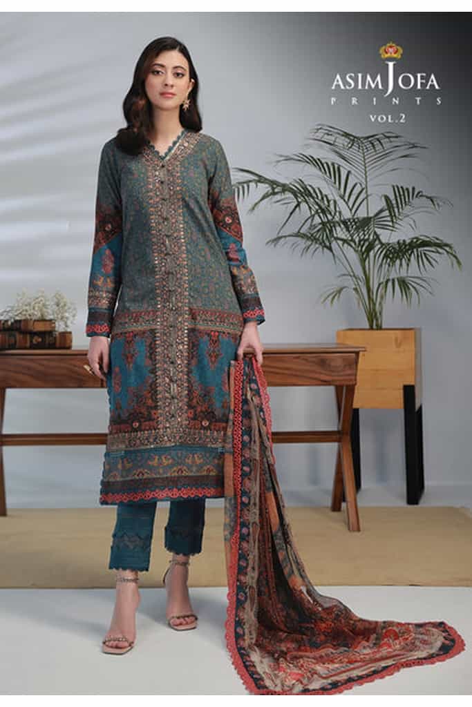 Unleash your inner art connoisseur with this design in teal blue, where the digitally printed lawn shirt and chiffon dupatta evoke the essence of contemporary art. The motifs intertwine like brushstrokes of an inspired artist, showcasing the beauty of abstraction. The embroidered borders and sleeves are akin to ornate frames that encase a precious painting, adding charm to this art-inspired ensemble. Embrace the artistry of ‘Asim Jofa Prints’.