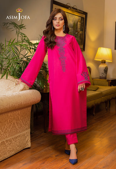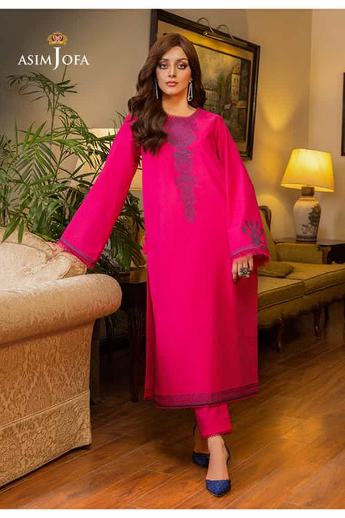 The raspberry-pink hue of this cambric shirt and trouser ensemble oozes an air of playfulness, making it a must-have for the fashion-savvy. The bold blue embroidery howls extravagance. Our trendy silhouettes will make you the talk of the town. Wear Asim Jofa and express yourself through fashion.