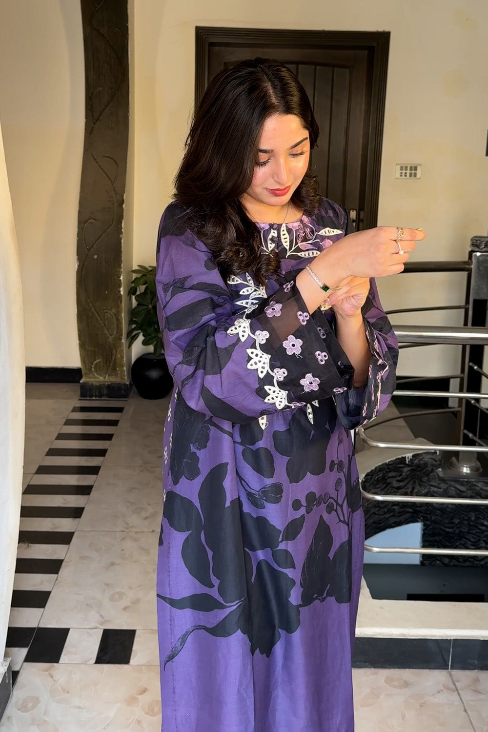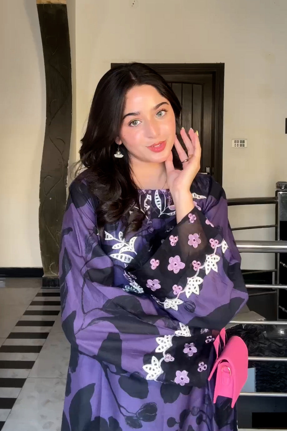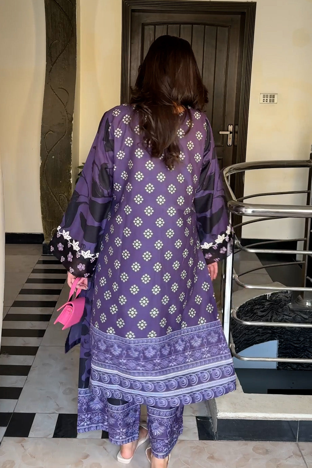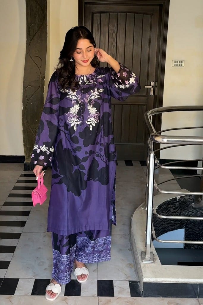 Step into contemporary elegance with this striking 2-piece pret ensemble, crafted from soft printed lawn for effortless style. The straight-long shirt features a graceful boat neckline, beautifully adorned with intricate embroidery and loop button detailing that adds a refined touch. Sleeves are finished with delicate embroidered organza, lending a subtle flair of sophistication. Paired with flared printed lawn pants that bring playful movement and modern charm to the outfit. Bold, breezy, and effortlessly chic—this look is your go-to for polished daytime dressing or laid-back festive gatherings.