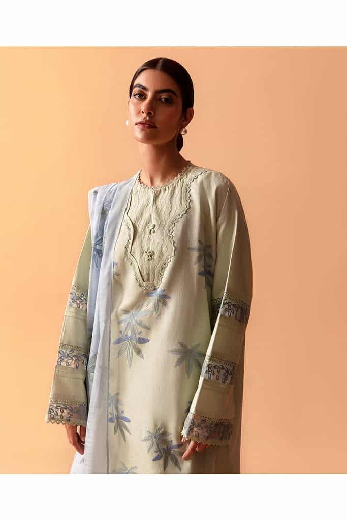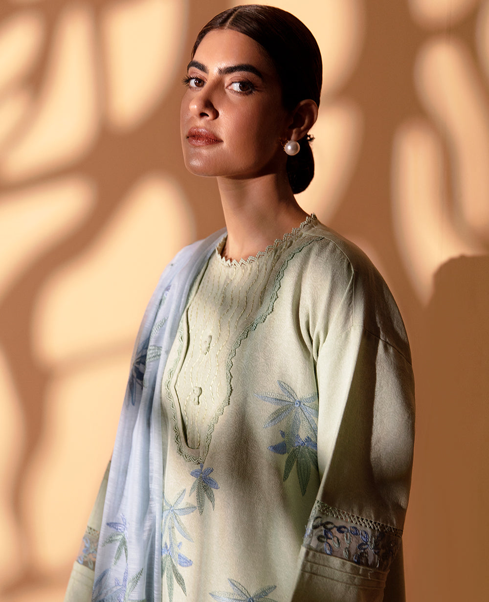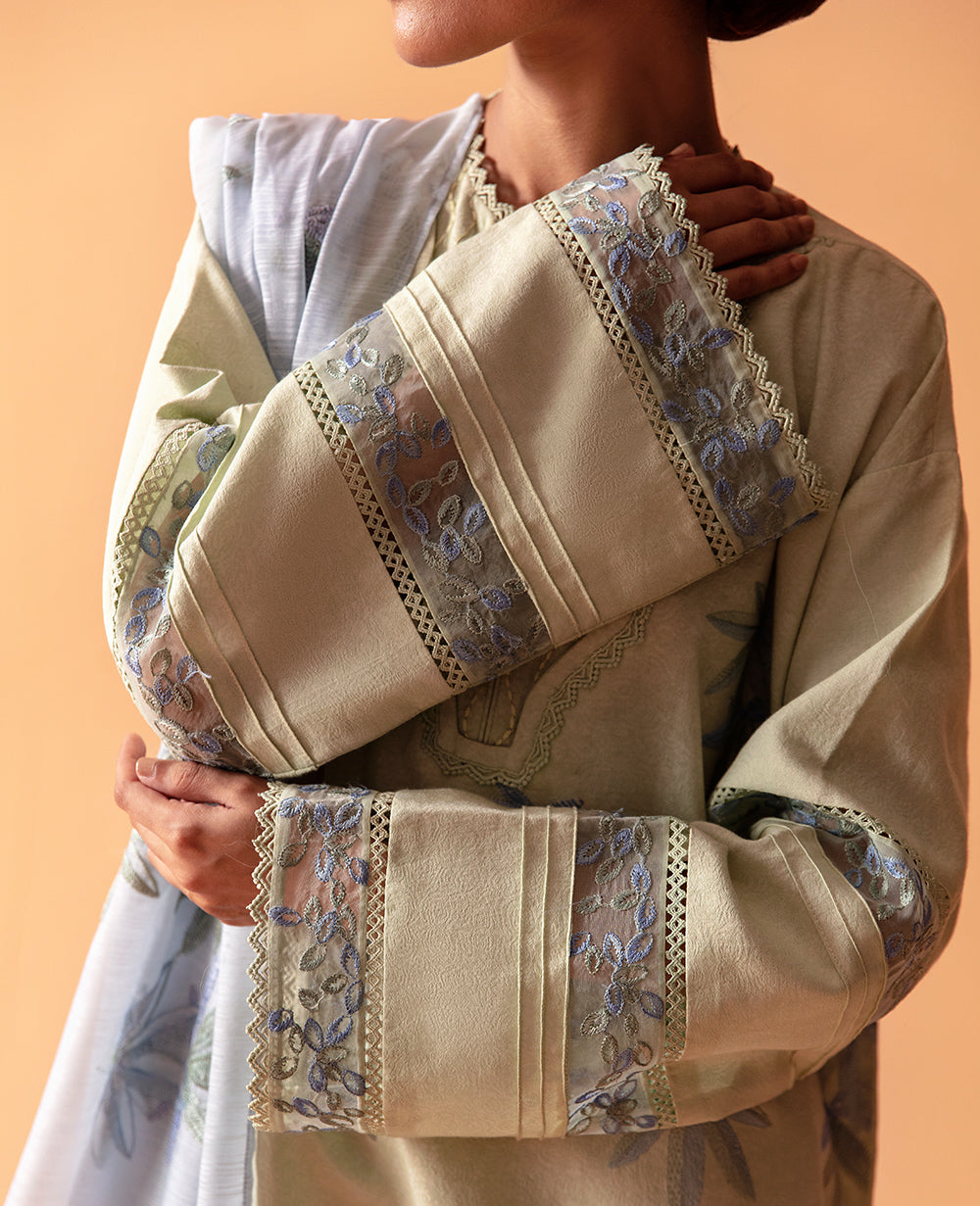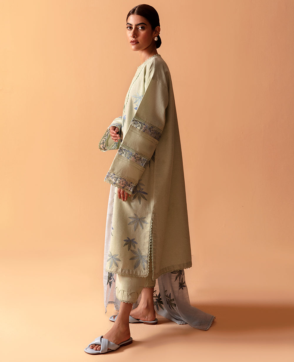 Immerse in the gentle zephyrs of summer, this everyday ensemble showcases a resplendent tapestry of fog green. Intricately woven leafy motifs meander across the shirt, a testament to the exquisite craftsmanship adorning every stitch. The sleeves boast embroidered organza borders, imbuing an ethereal touch that bewitches the senses. The neckline, adorned with meticulous stitching details, exudes an aura of refined elegance. A mesmerizing interplay of shades emerges as the contrasting dupatta drapes in hues reminiscent of a serene, greyish blue. Embrace the sun-kissed days, wrapped in breezy fabrics and an eternal charm that leaves onlookers spellbound.