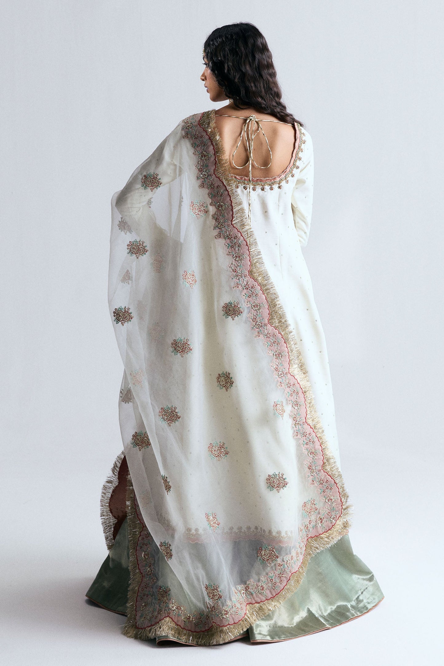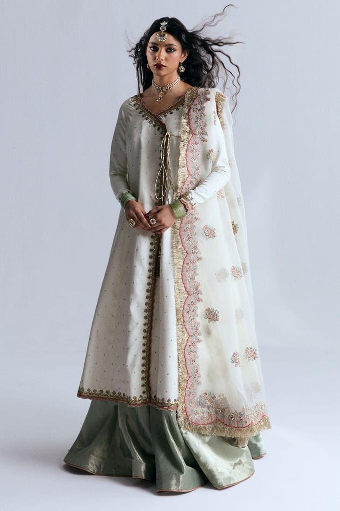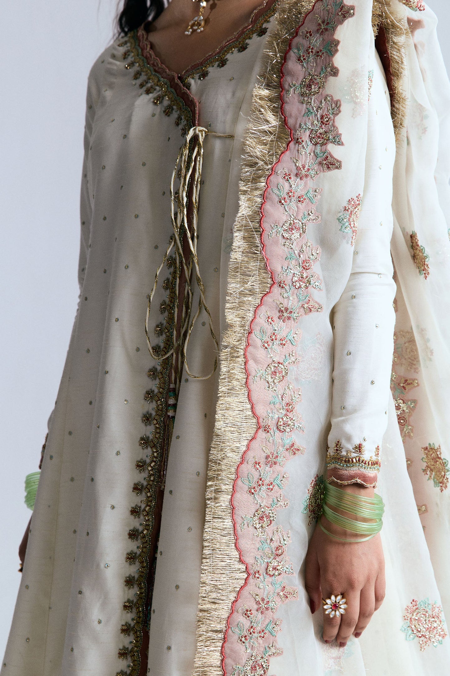 Chandani is an ivory angarkha, delicately handcrafted with dori and tissue detail, adorned with intricate scallops tracing the neckline, side, and hem. It is paired with a classic low gota sharara, which is finished with a soft tissue flare and an embroidered patti lining. The look is completed with a sheer organza dupatta, featuring embroidered scalloped borders and delicate kiran and tissue finish.