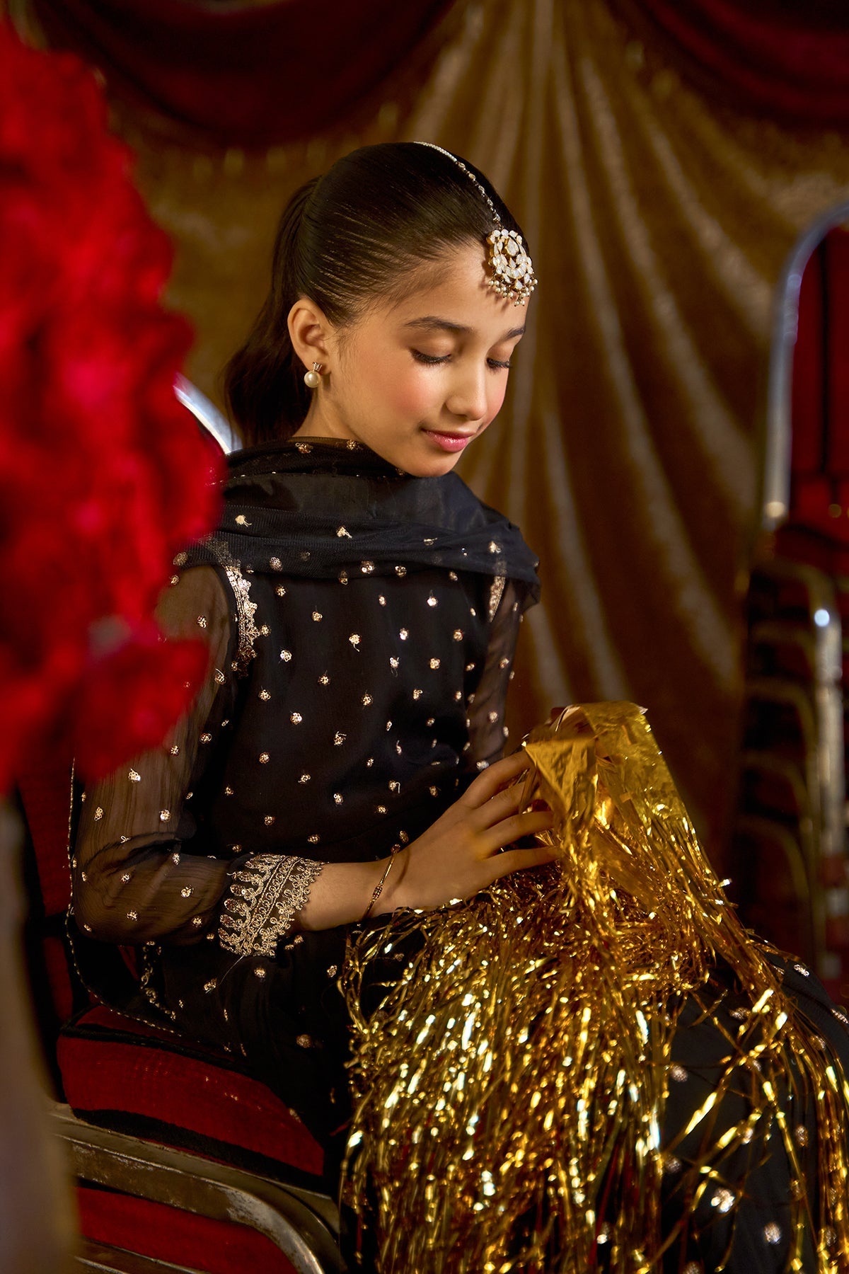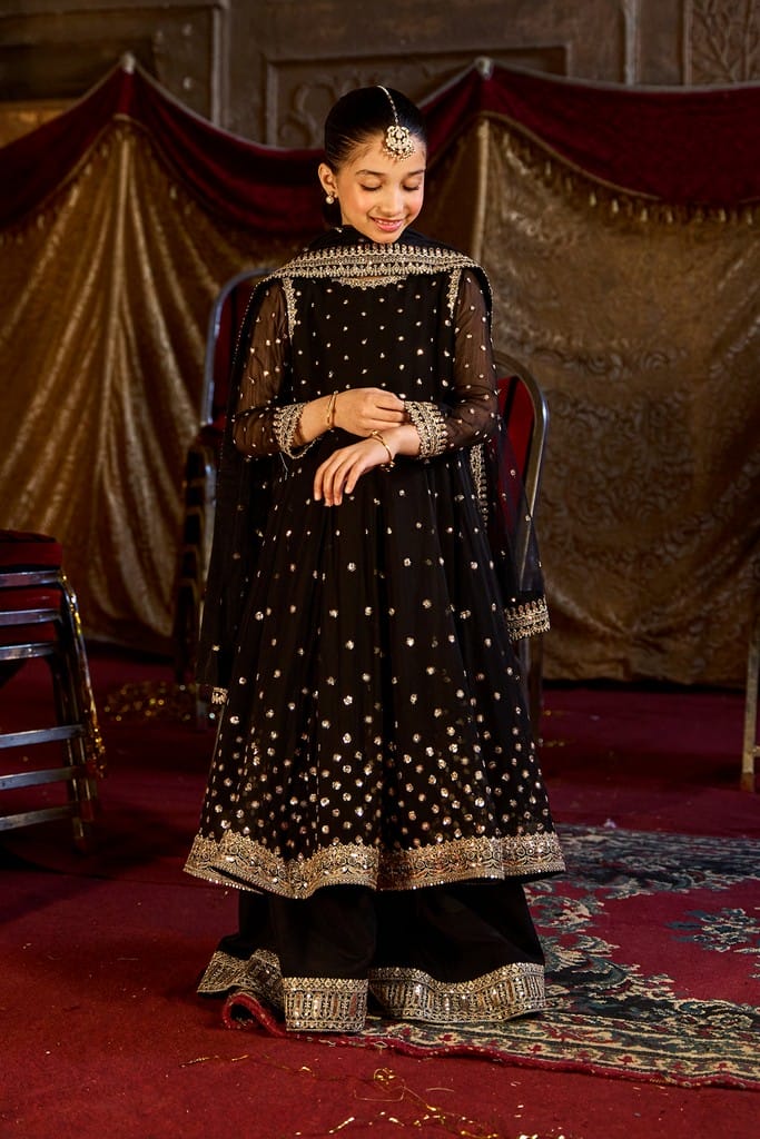 A dreamy long length pishwas crafted on pure chiffon, adorned with all over sequin work inspired detailing that adds an ethereal sheen paired with flared raw silk sharara with embroidered sequin and tilla border. The look is completed with a matching net dupatta featuring a scattered sequin spray and an intricately finished border for a timeless, regal appeal.