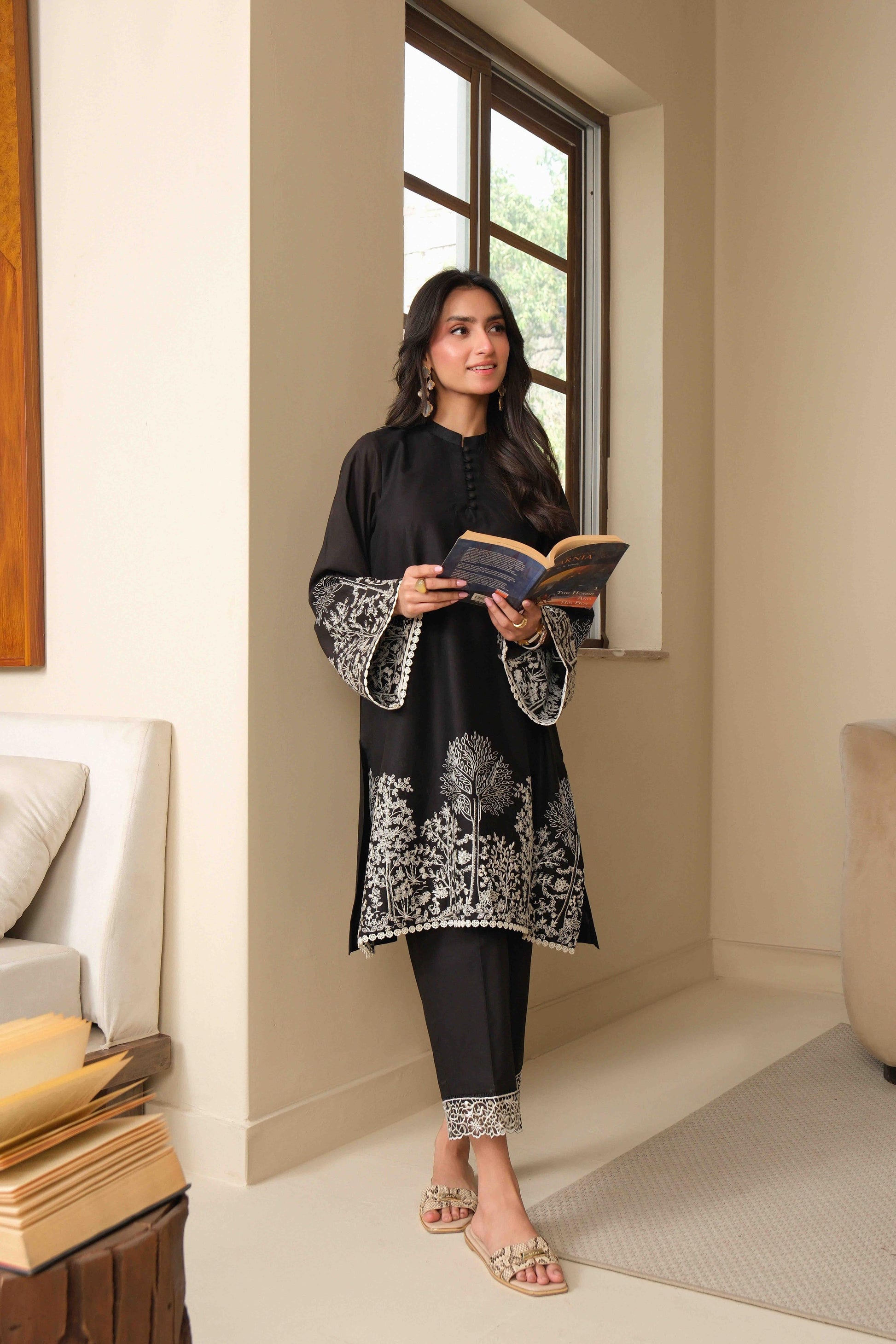This black two-piece outfit stands out with detailed white embroidery featuring trees, flowers, and subtle fauna. The design pops against the solid black premium lawn fabric, creating a sharp and eye-catching look. It’s simple, stylish, and easy to wear, perfect for when you want something classic with a bit of personality. Great for both casual meetups and slightly dressier occasions.