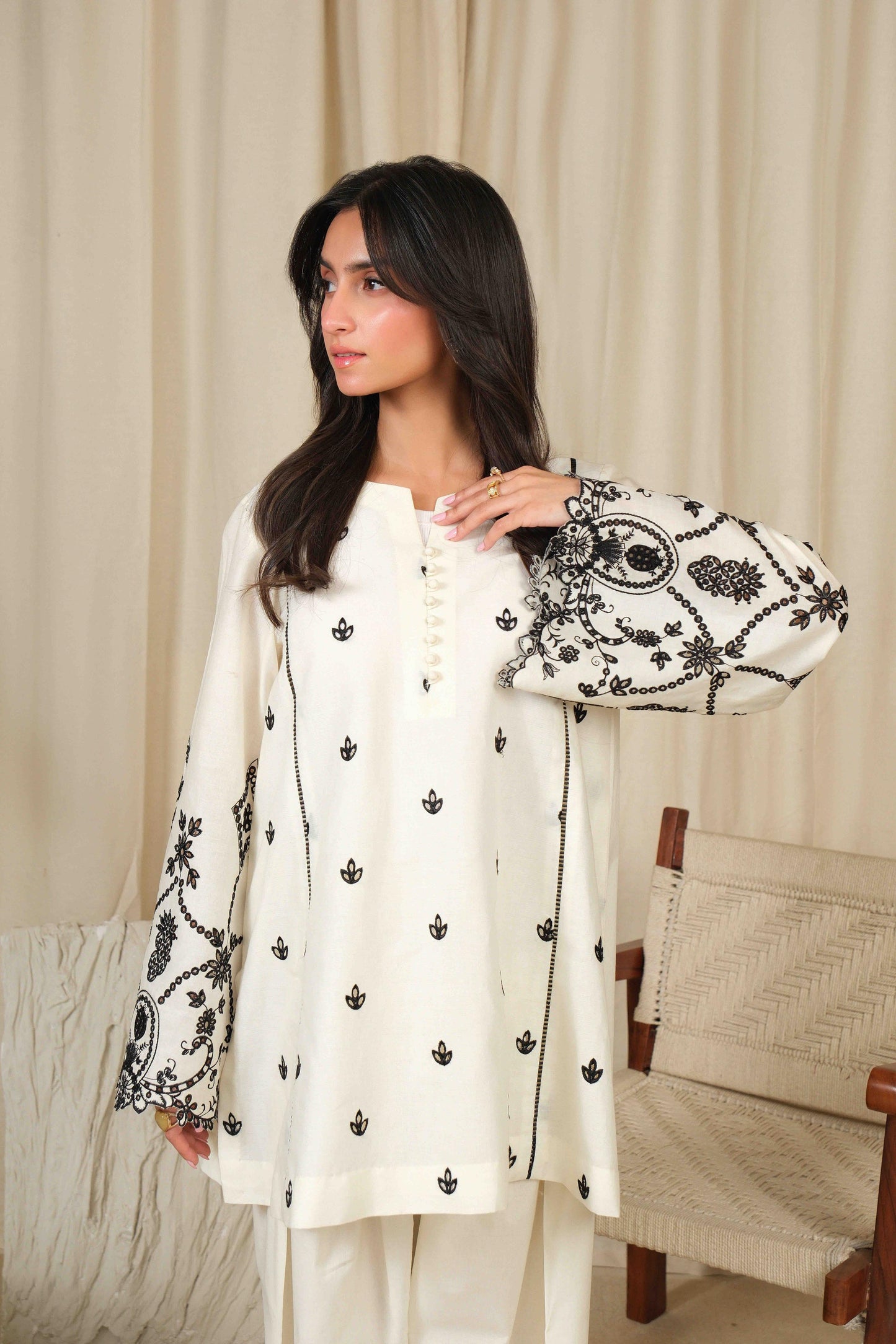 A case of modern sensibility, this white kurta is elevated with bold black embroidery that adds textural elegance to a clean silhouette. The monochrome palette is timeless, while the precision of embroidery offers a refined nod to heritage techniques. Ideal for contemporary minimalists who appreciate craftsmanship.