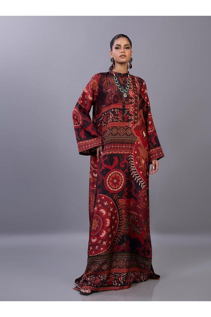 This kaftan is a flowing silhouette that drapes beautifully, offering a relaxed yet regal look. Drenched in a rich, multi-tonal print of earthy ochres, deep teals, and sunset reds, the kaftan is adorned with intricate traditional and geometric printed borders. The wide sleeves and floor-length cut provide a dramatic sense of movement, making it the perfect choice for an effortless Eid transition from daytime elegance to evening glamour.