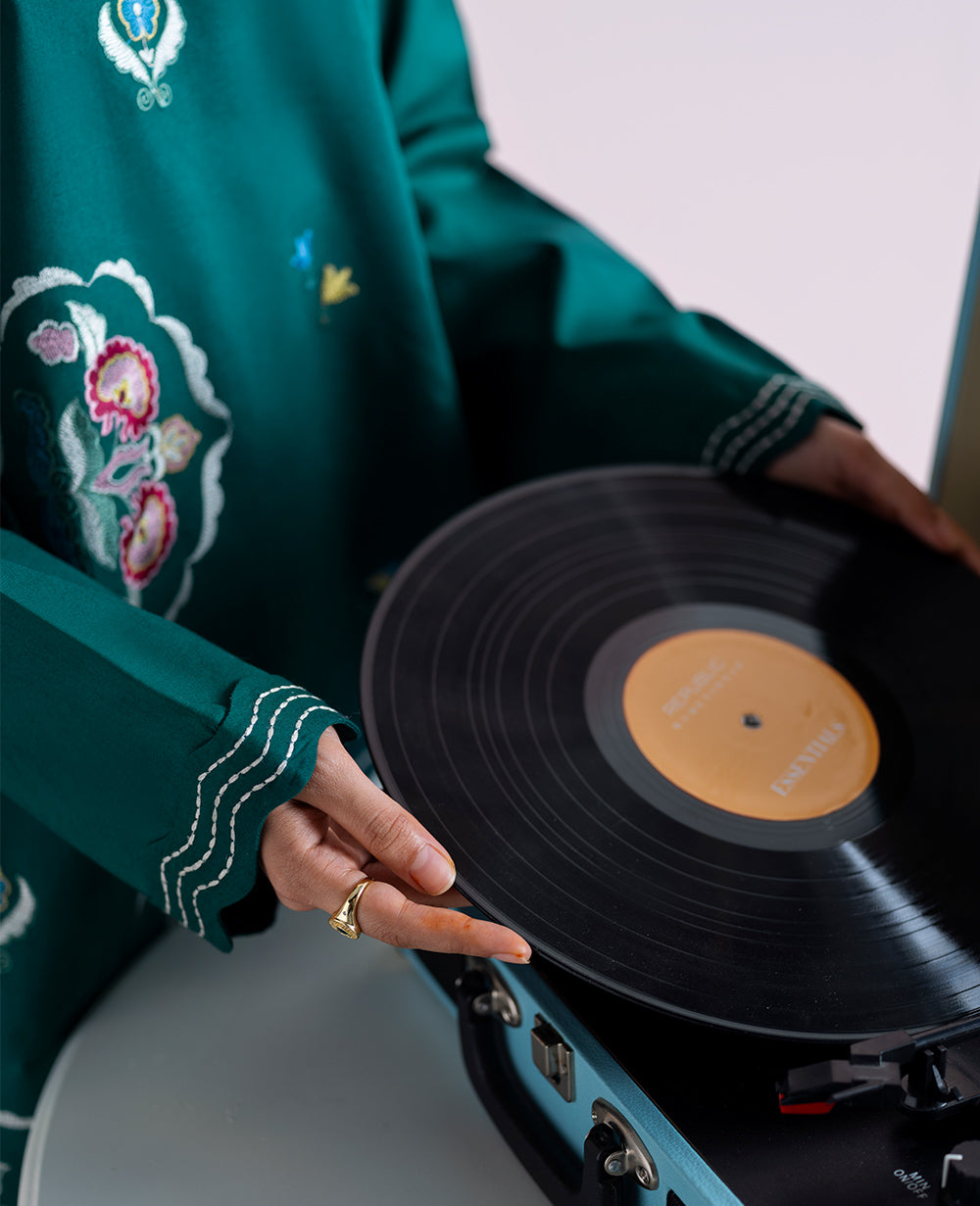 A striking emerald green short-length shirt, beautifully adorned with Suzani-inspired embroidery in vibrant hues of red, pink, white, and soft yellow. Featuring a scalloped, asymmetric neckline for a touch of modern elegance, and paired with scalloped side-cut pants to complete this effortlessly refined look.