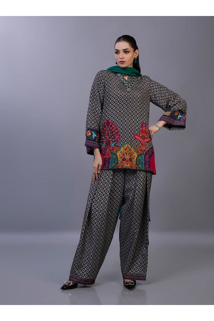 Fusing high-street edge with traditional grace, this ensemble features a sophisticated short-length shirt paired with a dramatic farshi shalwar. The outfit is bathed in a deep obsidian hue, serving as a canvas for an intricate, all-over geometric micro-print that adds a rhythmic texture to the look. The shirt is further elevated by vibrant, hand-placed floral appliqués on the back and hem, adding a pop of jewel-toned color. The voluminous farshi shalwar provides a majestic, sweeping flare, creating a silhouette that is both regal and distinctly modern.