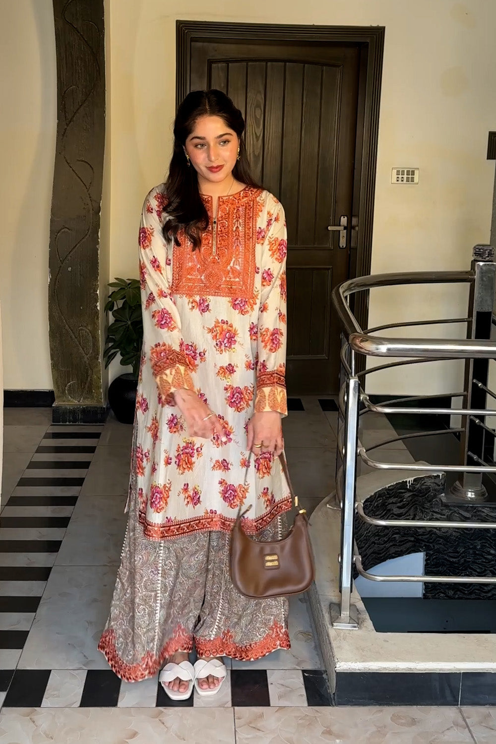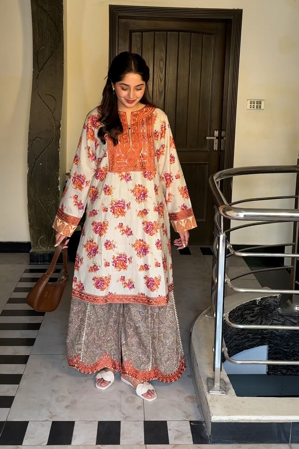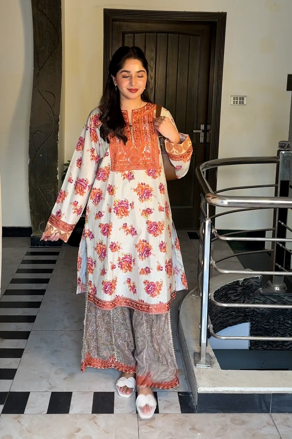 Embrace effortless charm in this dreamy Cream 2-piece pret ensemble, perfect for graceful summer days. The printed lawn short shirt features a classic round neckline and a delicately rounded embroidered hem, adding a soft, feminine finish to the silhouette. Paired with flared printed trousers, beautifully designed with scalloped hems and intricate lace and embroidery detailing for added flair. The light and breathable fabric ensures comfort, a blend of playfulness and sophistication, this set is your go-to for refined casual dressing.
