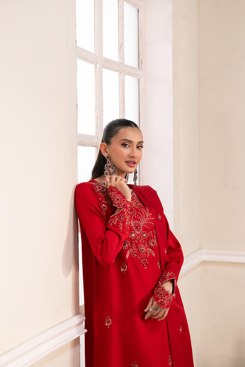 Radiate elegance in this striking 3-piece pret set in classic Red. Crafted from pure silk, the shirt features intricate adda work and delicate embroidery, paired with matching silk trousers. The tissue silk dupatta adds a graceful, airy touch—perfect for festive and formal occasions.