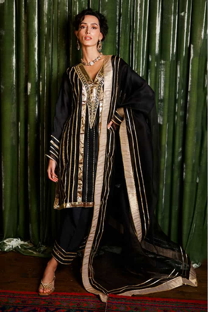A mesmerizing ode to the timeless elegance of black. Raw silk adorned with intricate gota work, perfect for making a statement.