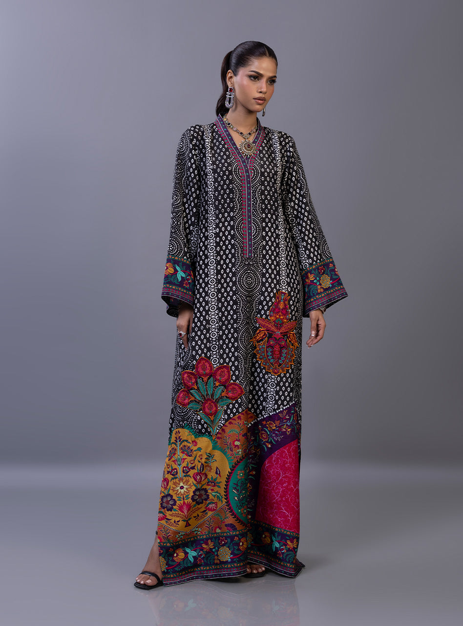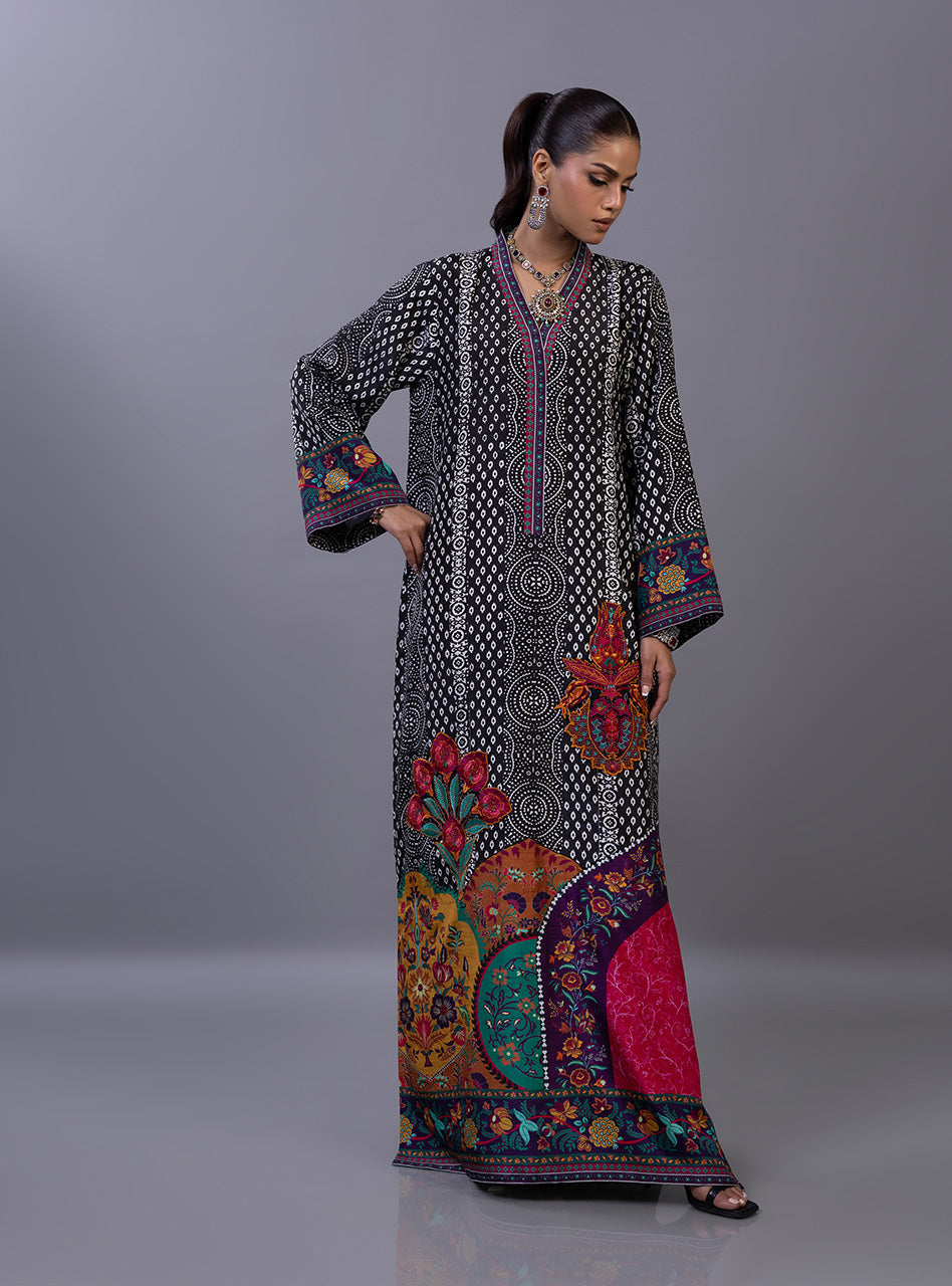 Command the room in this majestic floor-length printed kaftan, where classic monochrome meets a burst of festive color. The garment features an intricate, all-over white geometric dot print on a deep black base, creating a rhythmic and slimming visual effect. The relaxed, flowing silhouette and wide sleeves offer a regal drape, ensuring both comfort and a high-fashion edge. Perfect for evening celebrations, this piece is a masterclass in balancing traditional patterns with a bold, contemporary aesthetic