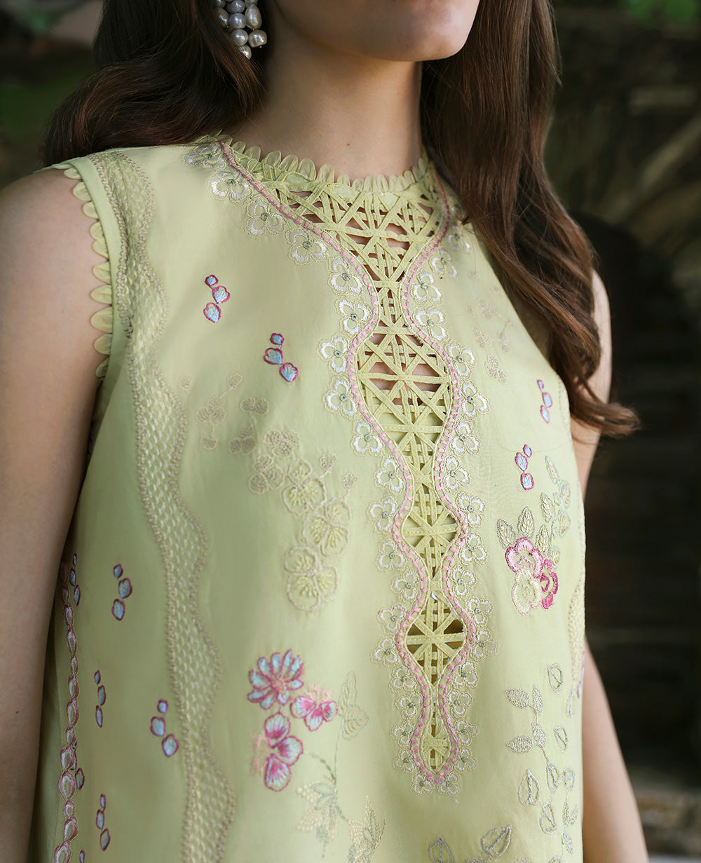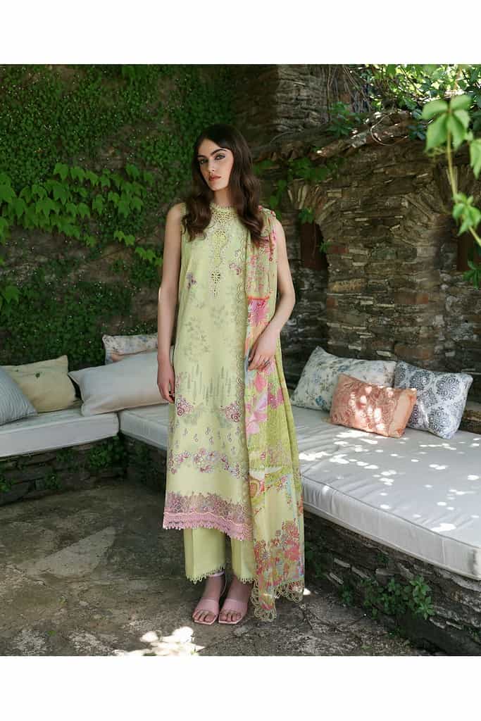 Lunara in apple green is a vision of summer freshness, with vibrant embroidered hues complemented by organza patches and a colorful silk dupatta. This ensemble makes a stylish statement with its lively color palette and detailed craftsmanship.