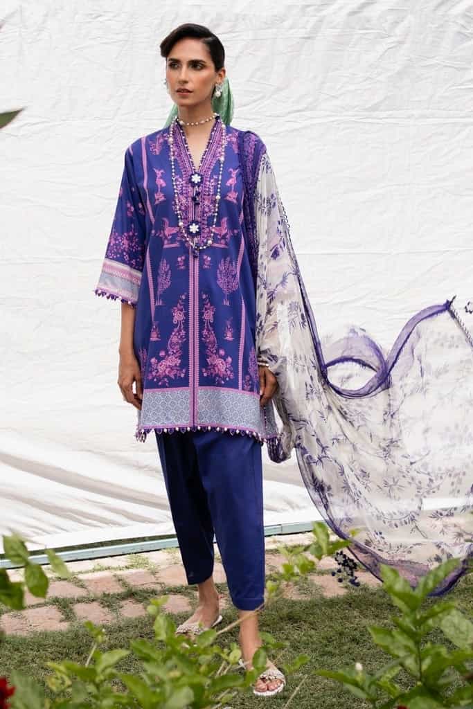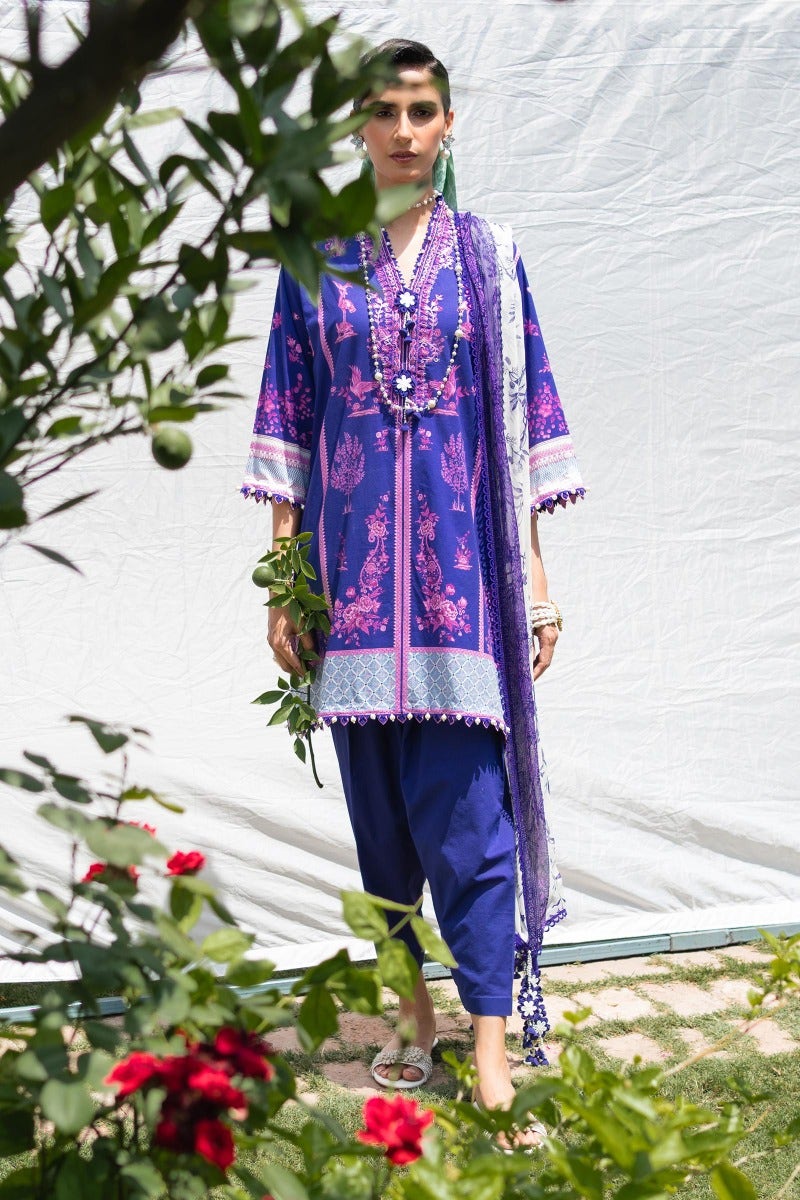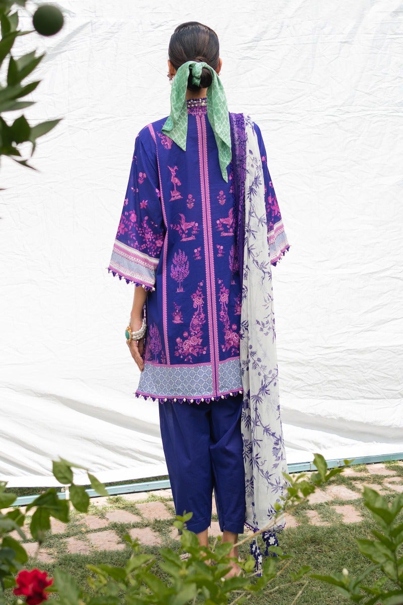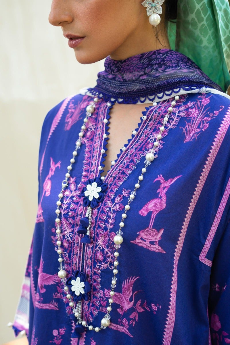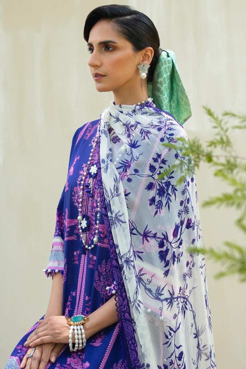 A symphony of cultural inspirations converges in a fusion of elegance, as a digital printed lawn shirt adorned with Mughal and Chinese motifs harmonizes with comfortable cotton dyed pants. An ethereal silver chiffon dupatta weaves intricate patterns inspired by English trellis and Jamawar, crafting a tapestry of transcendent beauty.