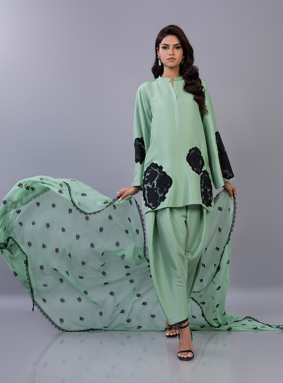 Exude contemporary charm in this refreshing mint green ensemble. The chic, short shirt is highlighted by bold, black floral applique motifs that make a striking statement on the side and sleeves. It is paired with a comfortable, matching shalwar for a modern silhouette. The look is completed with a lightweight dupatta featuring scattered small black embroidered motifs and a delicate black lace border, making it a perfect, stylish choice for daytime festive events.