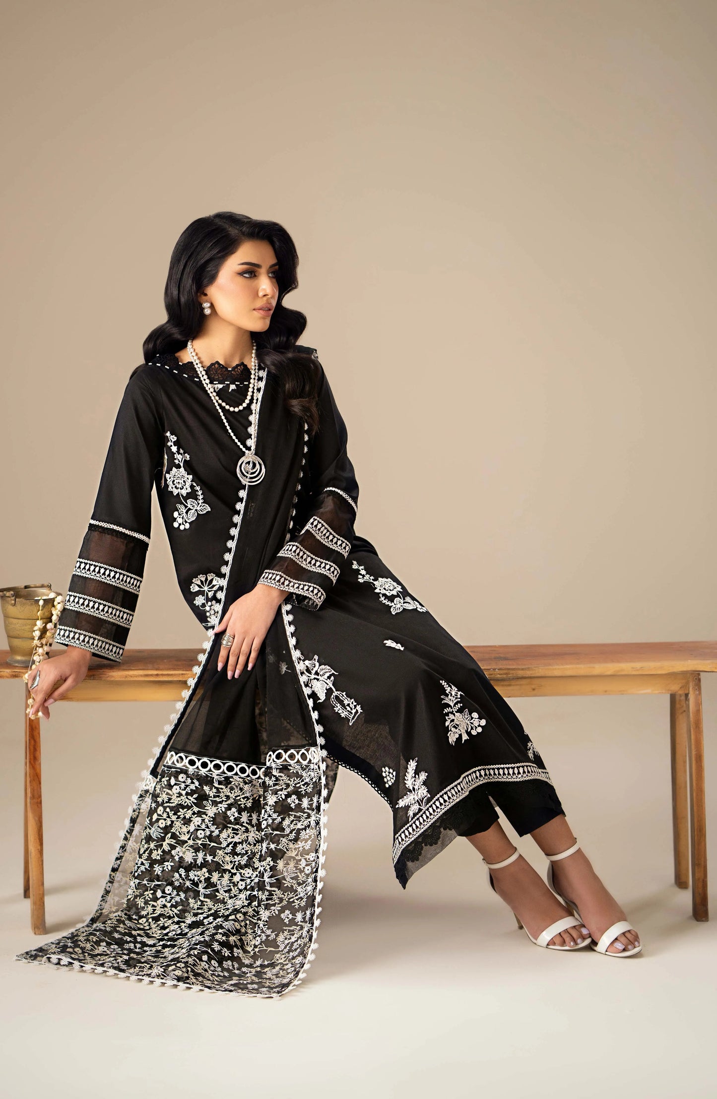 Be a fashionista with this 3 piece embroidered dress! Made with premium materials like chiffon and organza dupatta, lawn shirt, and cotton trouser, this dress exudes elegance and style. Perfect for all occasions, it's a must-have for any woman's wardrobe. (Fashionable, elegant, versatile.)