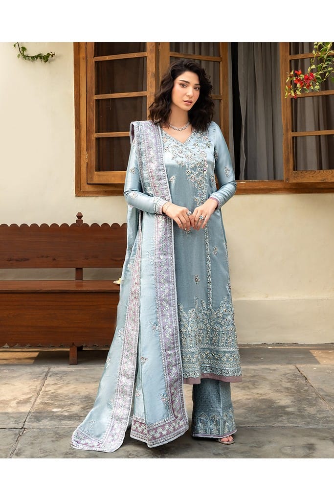 • Graceful zari tissue dupatta adorned with an embroidered border and delicate floral motifs.