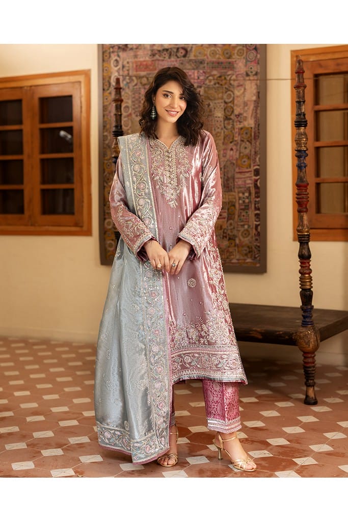• Elegant zari tissue fabric with detailed embellishments.