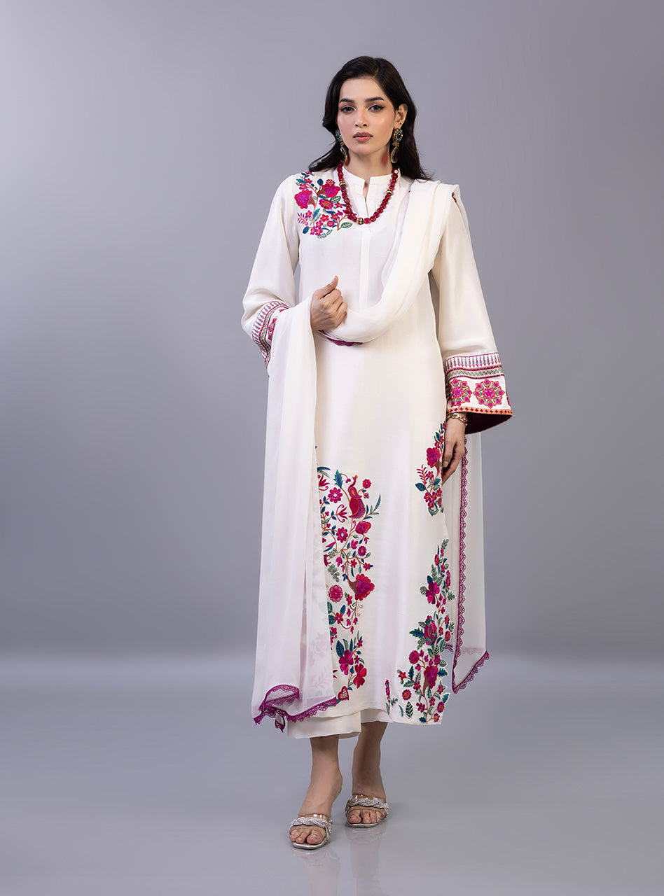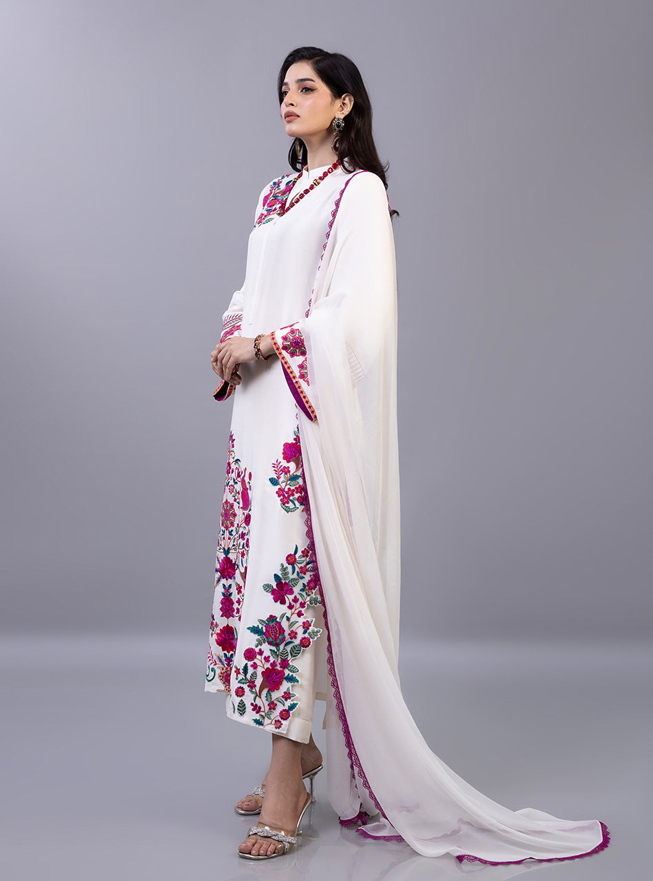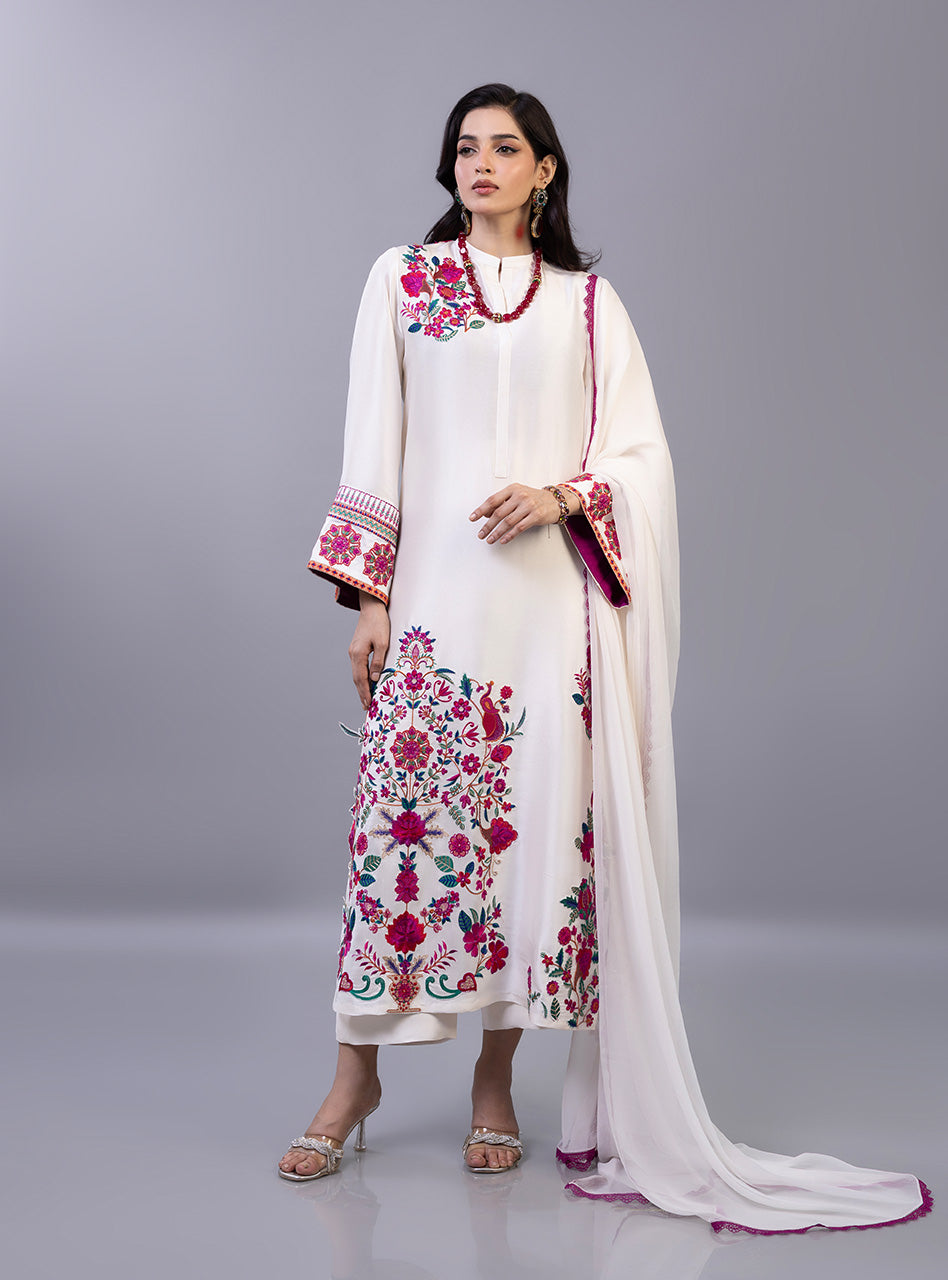 The shirt is masterfully detailed with a lush garden of crimson and fuchsia floral motifs that trail elegantly along the hemline and bloom across the shoulder in a sophisticated asymmetrical design. The sleeves feature intricate geometric borders paired with matching floral accents, perfectly complemented by a lightweight dupatta finished with a delicate magenta lace trim and matching pants. This exquisite piece balances a serene off-white base with high-definition embroidery, making it a luxurious choice for celebratory daytime gatherings and festive soirées alike.
