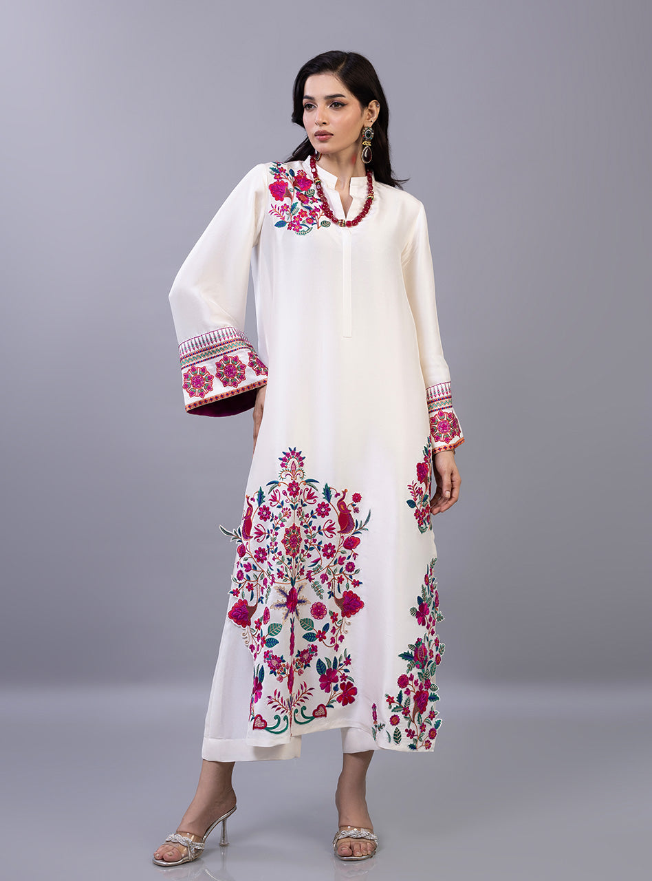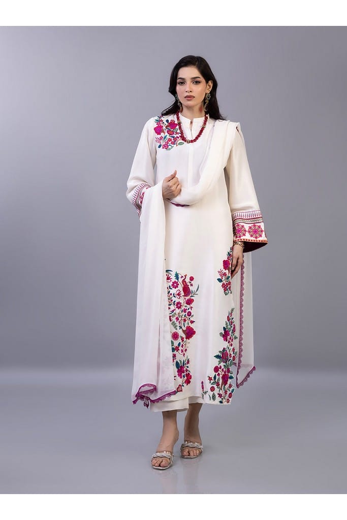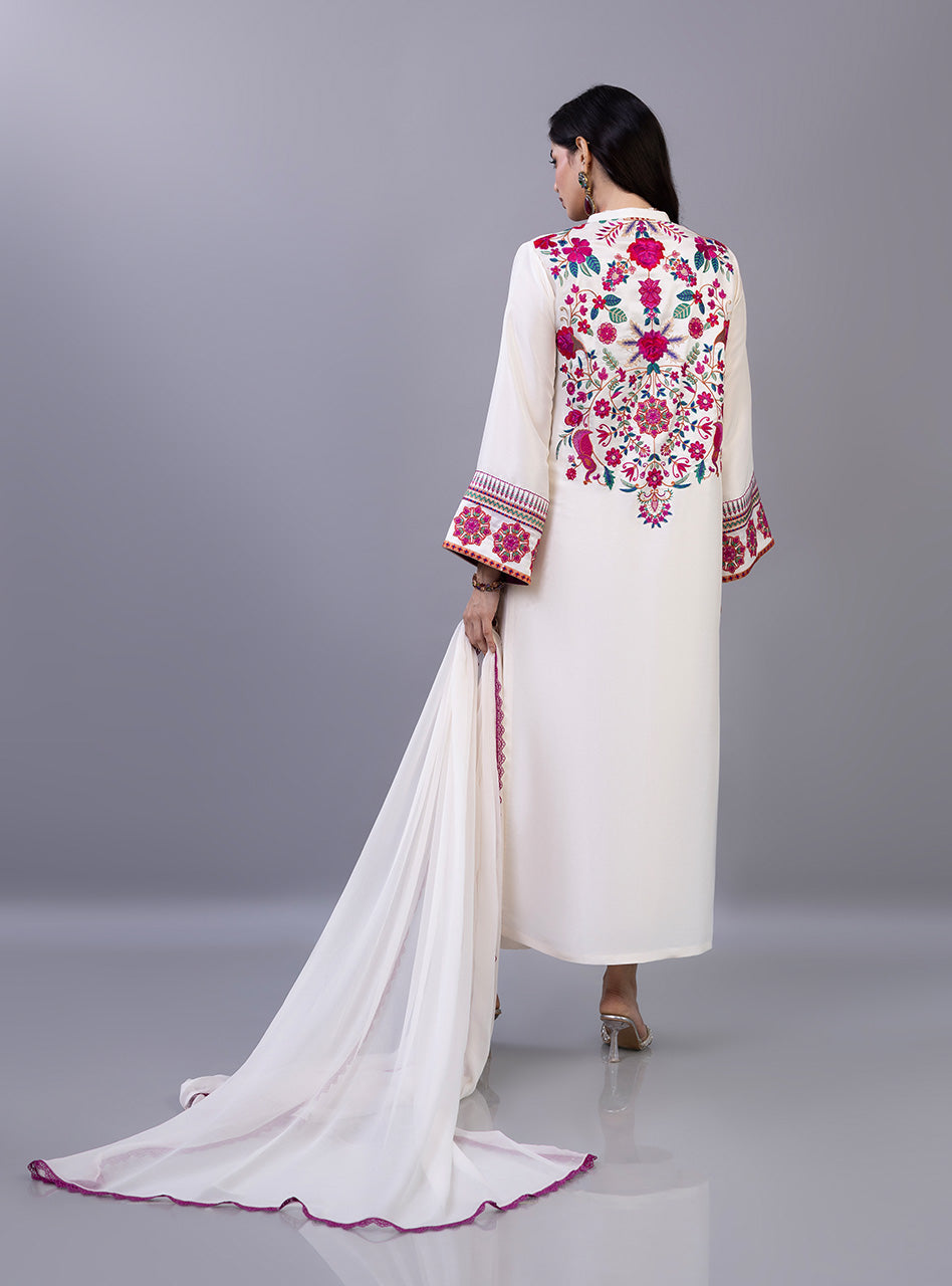 The shirt is masterfully detailed with a lush garden of crimson and fuchsia floral motifs that trail elegantly along the hemline and bloom across the shoulder in a sophisticated asymmetrical design. The sleeves feature intricate geometric borders paired with matching floral accents, perfectly complemented by a lightweight dupatta finished with a delicate magenta lace trim and matching pants. This exquisite piece balances a serene off-white base with high-definition embroidery, making it a luxurious choice for celebratory daytime gatherings and festive soirées alike.
