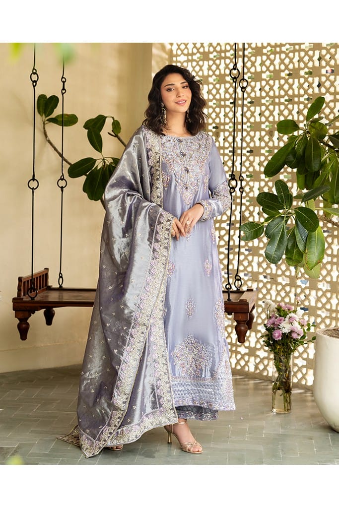 • Graceful zari tissue dupatta showcasing a wide embroidered pallu and shimmering accents.