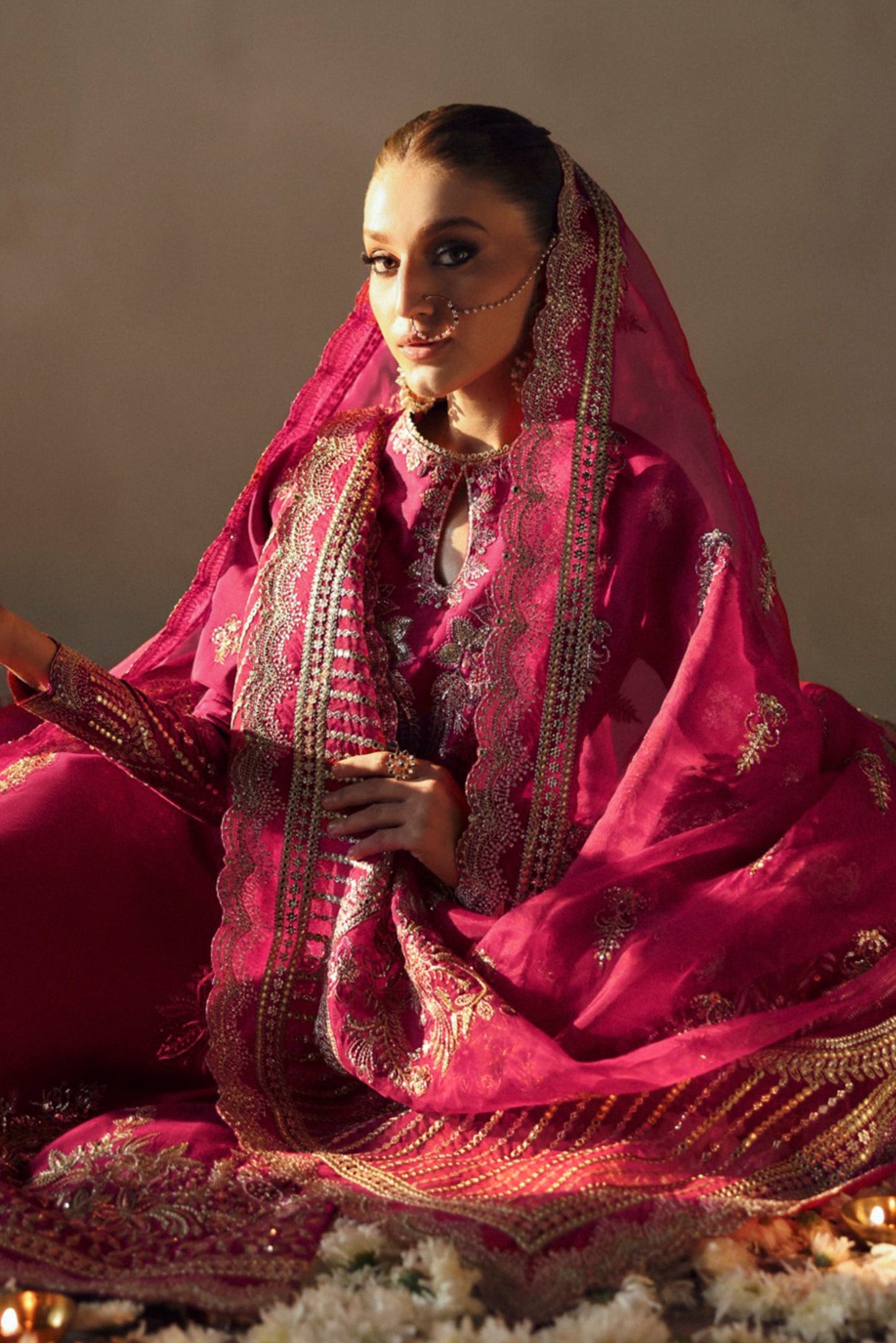 This exquisite ensemble is crafted from luxurious dark pink raw silk, exuding richness and elegance. The ensemble is paired with a sheer organza dupatta, beautifully detailed with a four-sided embroidered border. The trouser features intricate embroidery, adding a striking focal point to the design. Perfect for festive gatherings and special occasions, this outfit combines timeless charm with refined sophistication.
