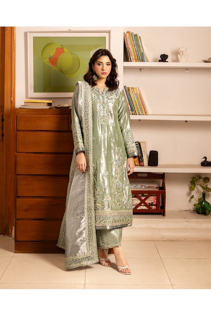 • Luminous zari tissue dupatta with a heavy embroidered border and sequin spray.
