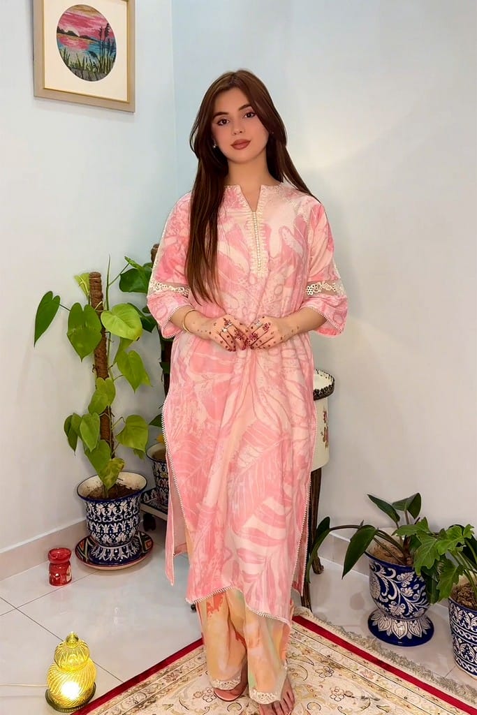 Embrace soft elegance in this beautiful 2-piece pret in a charming Ballerina shade. The printed lawn shirt features a graceful crew neckline with delicate pearl detailing that adds just the right touch of femininity. Quarter sleeves are enhanced with organza accents, bringing subtle texture to the overall look. The long silhouette pairs effortlessly with flared contrast trousers, adding a playful yet refined twist. Light, breathable, and thoughtfully detailed—perfect for a daytime gathering or a breezy summer outing.