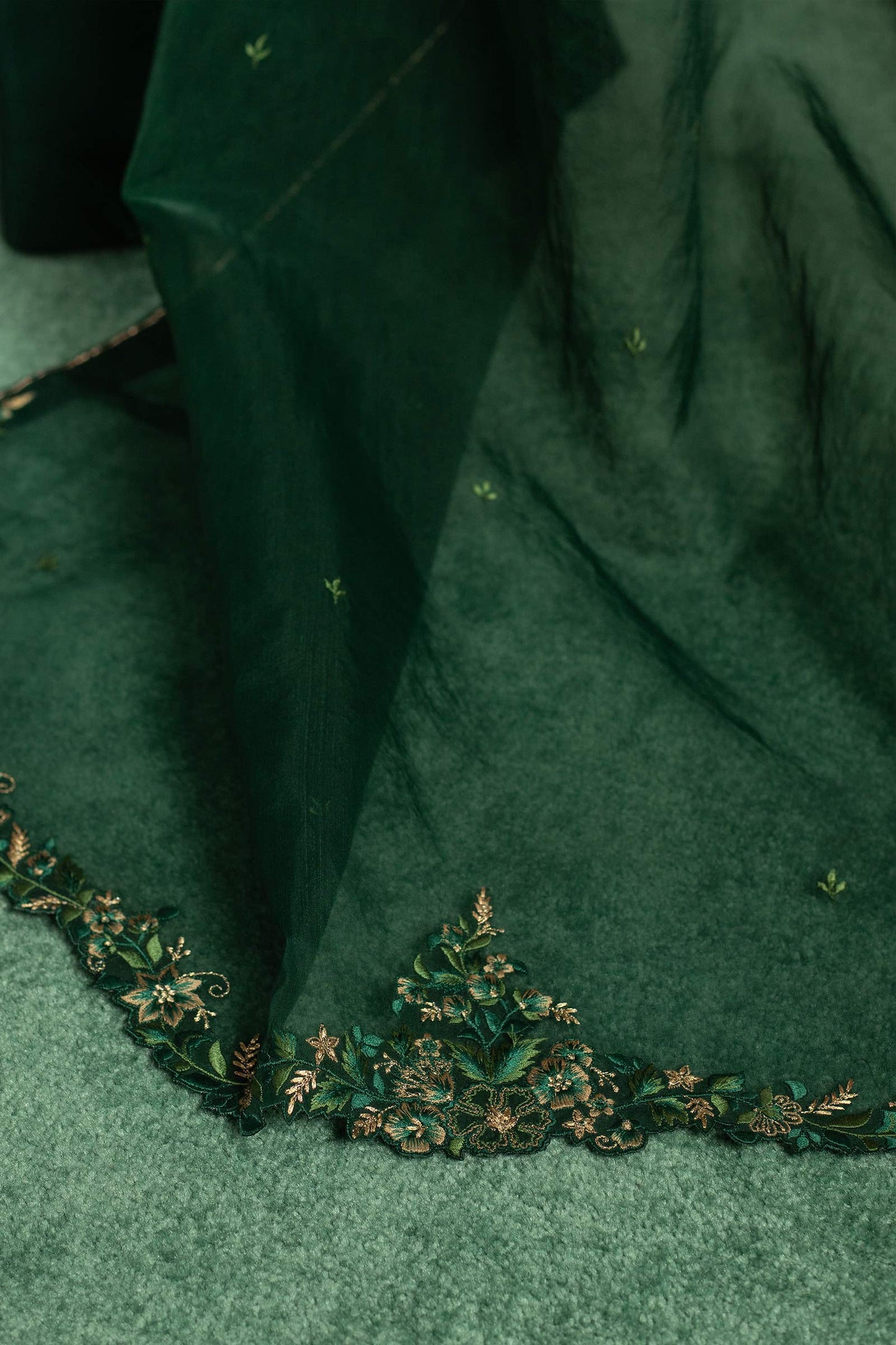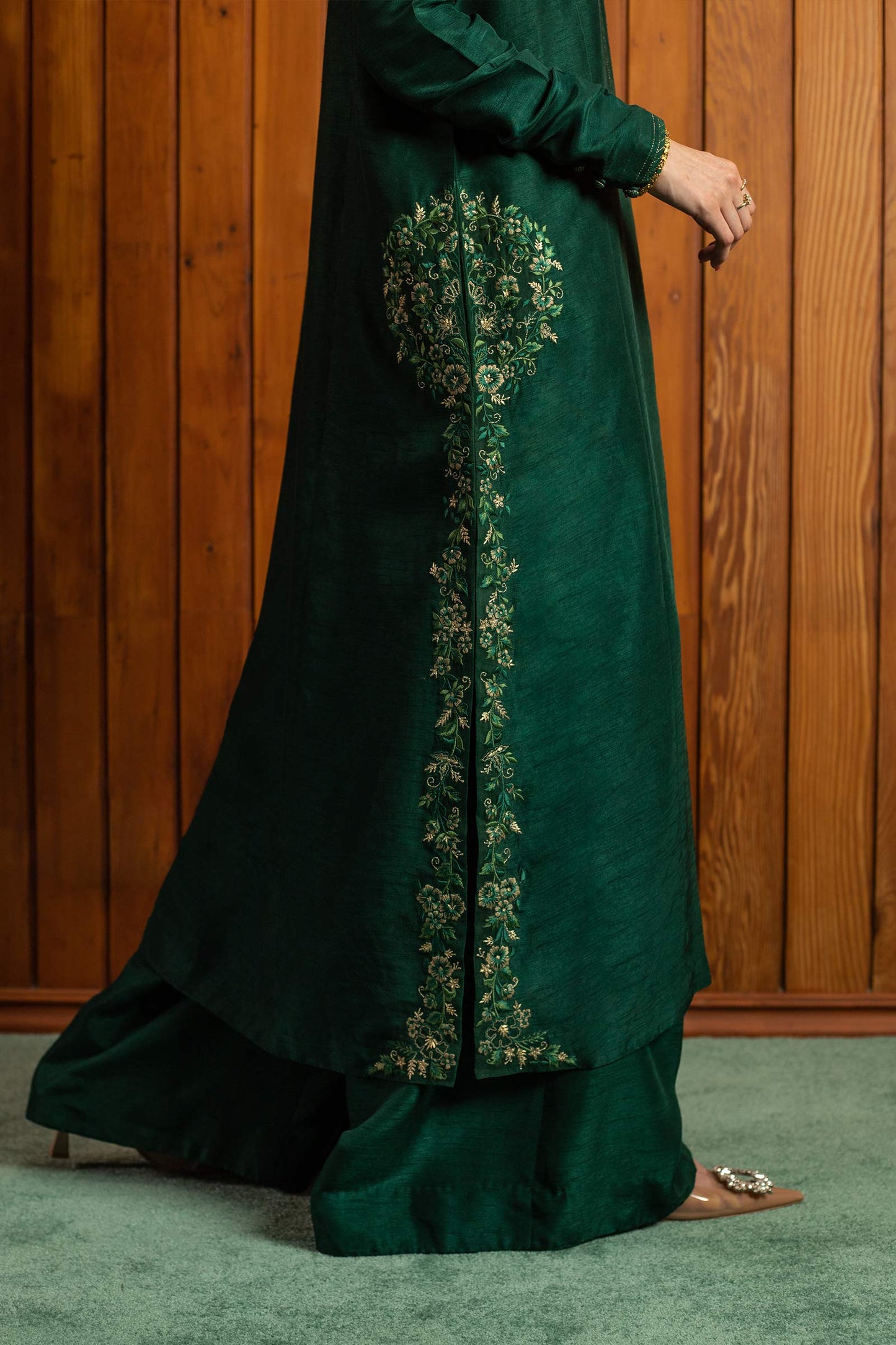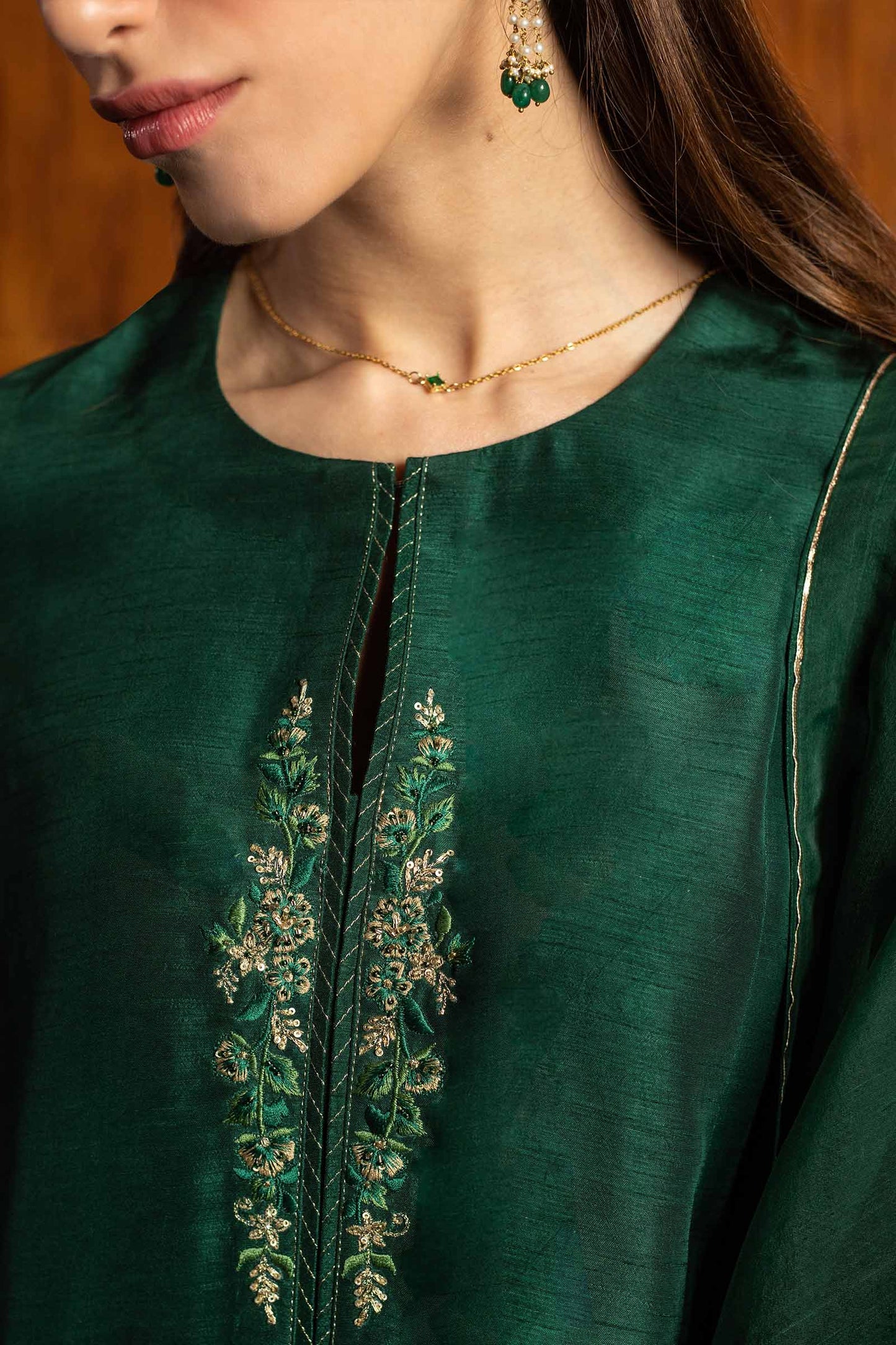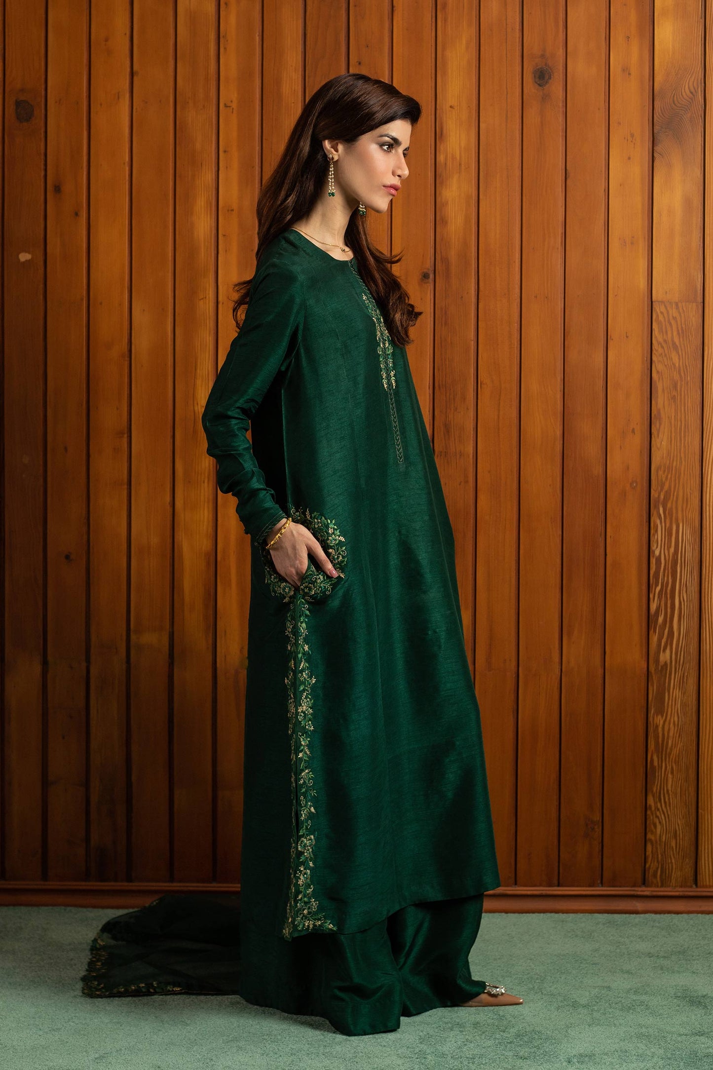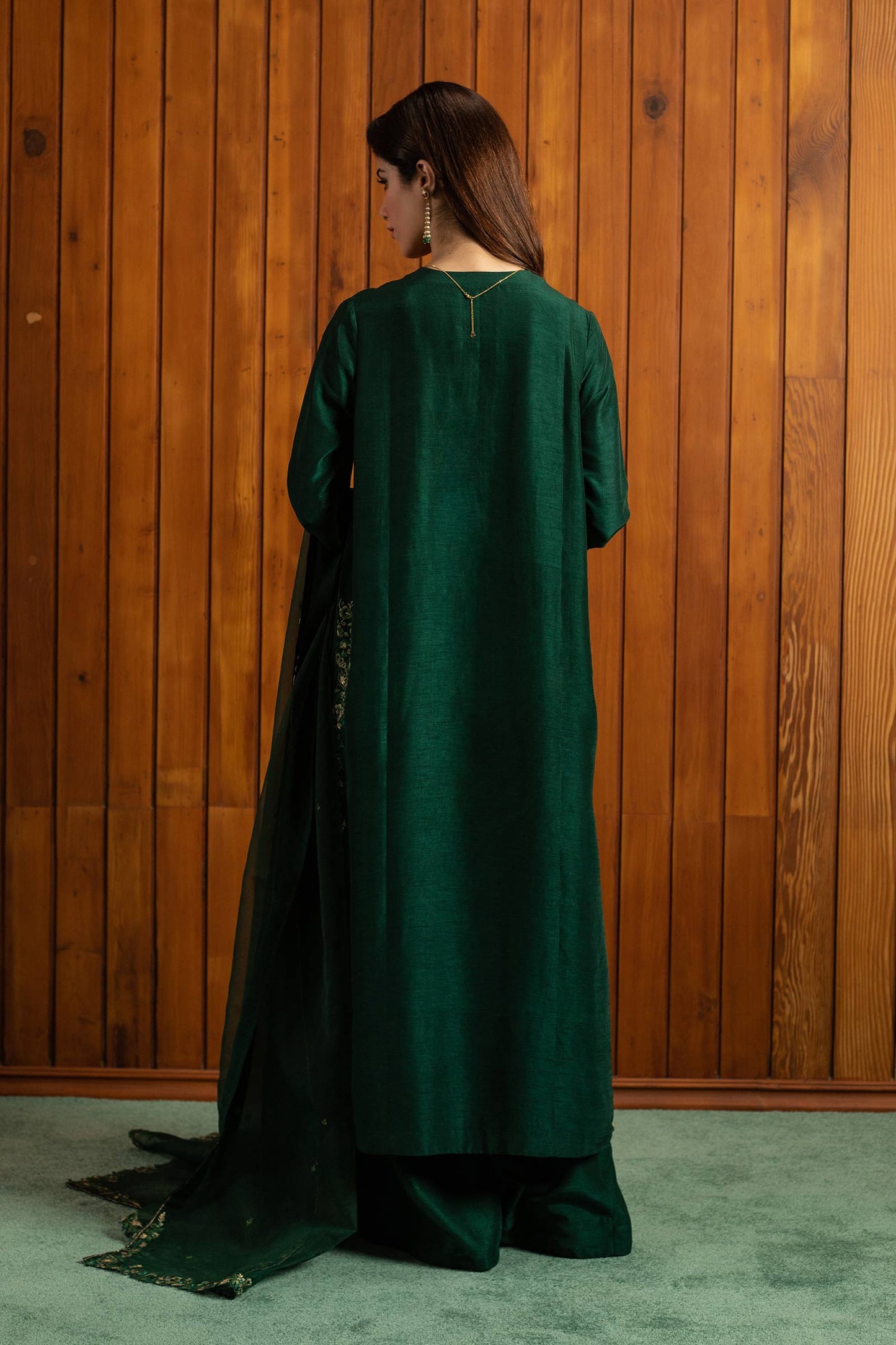Straight shirt in dark green having embroidery on side seams and neckline, enhanced with adda work. Paired with embroidered dupatta and loose trousers.