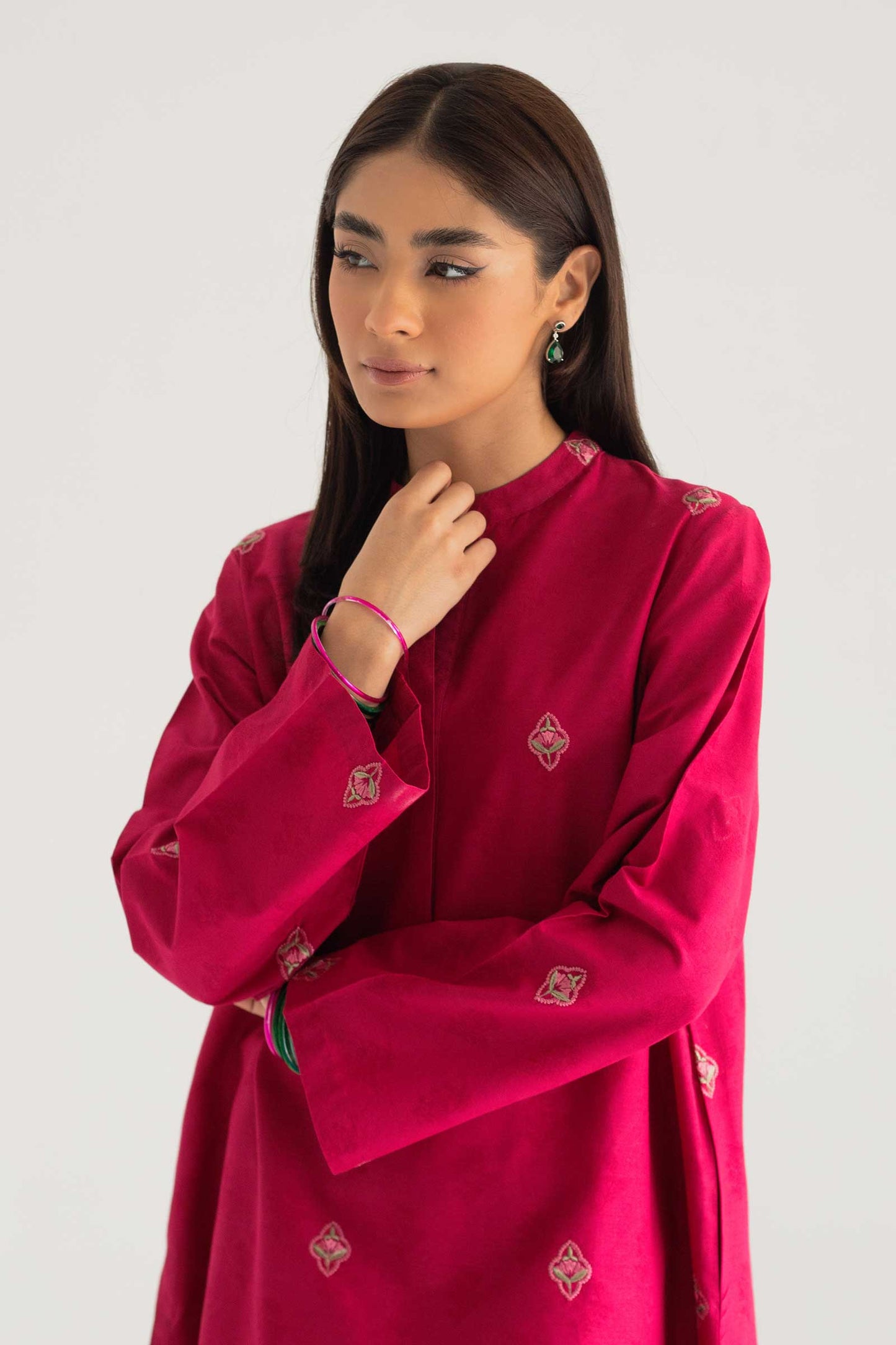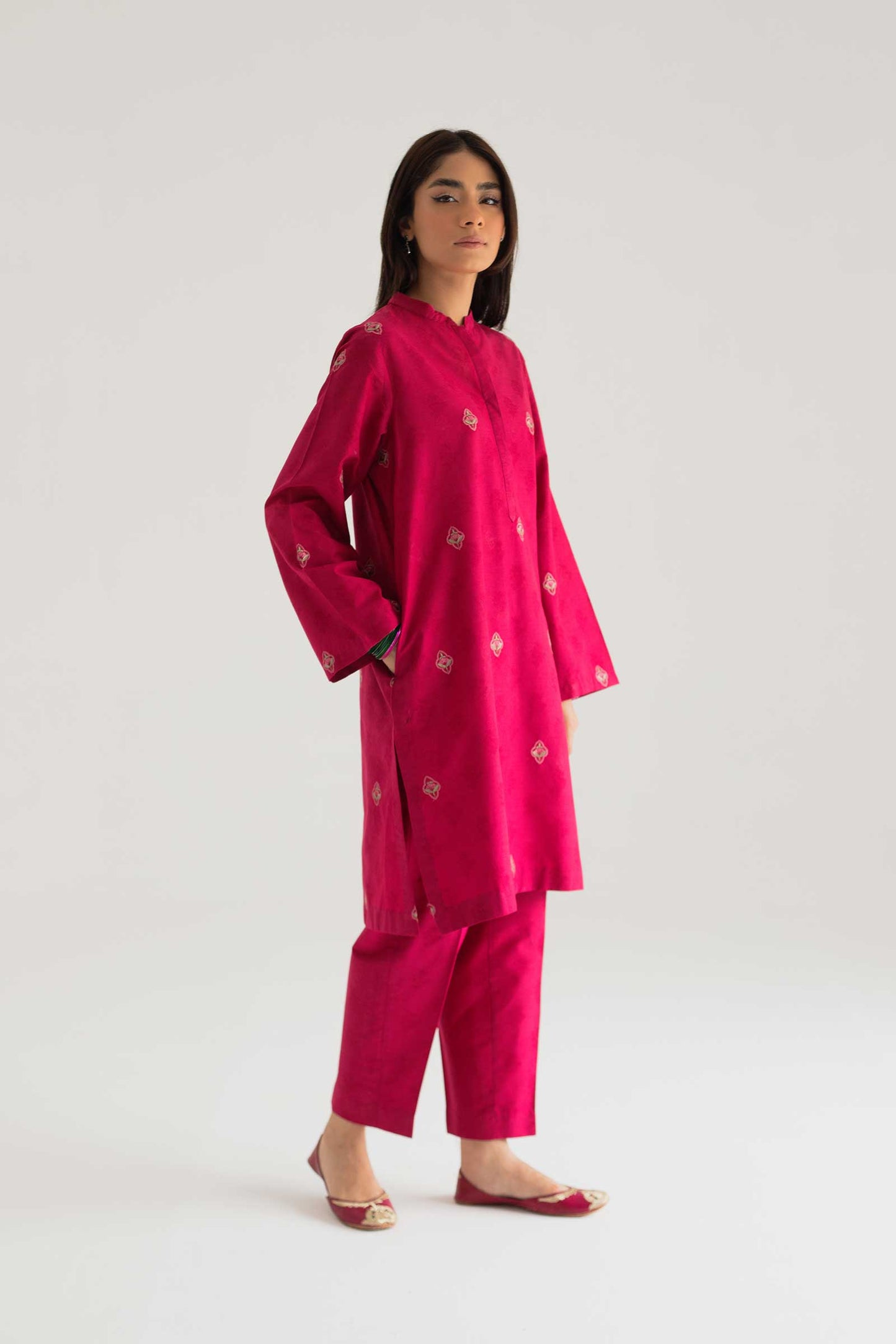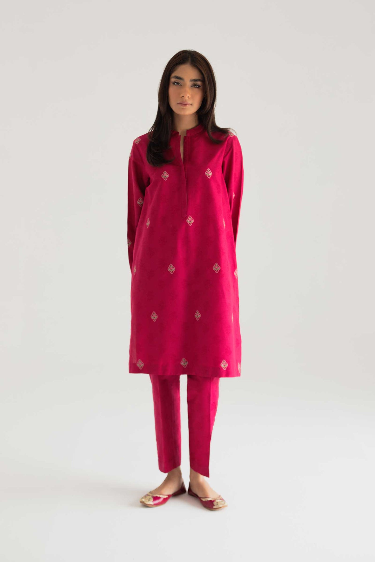 Loose, straight-fit pink kurta with embroidered spray all over. Paired with straight fit pants.