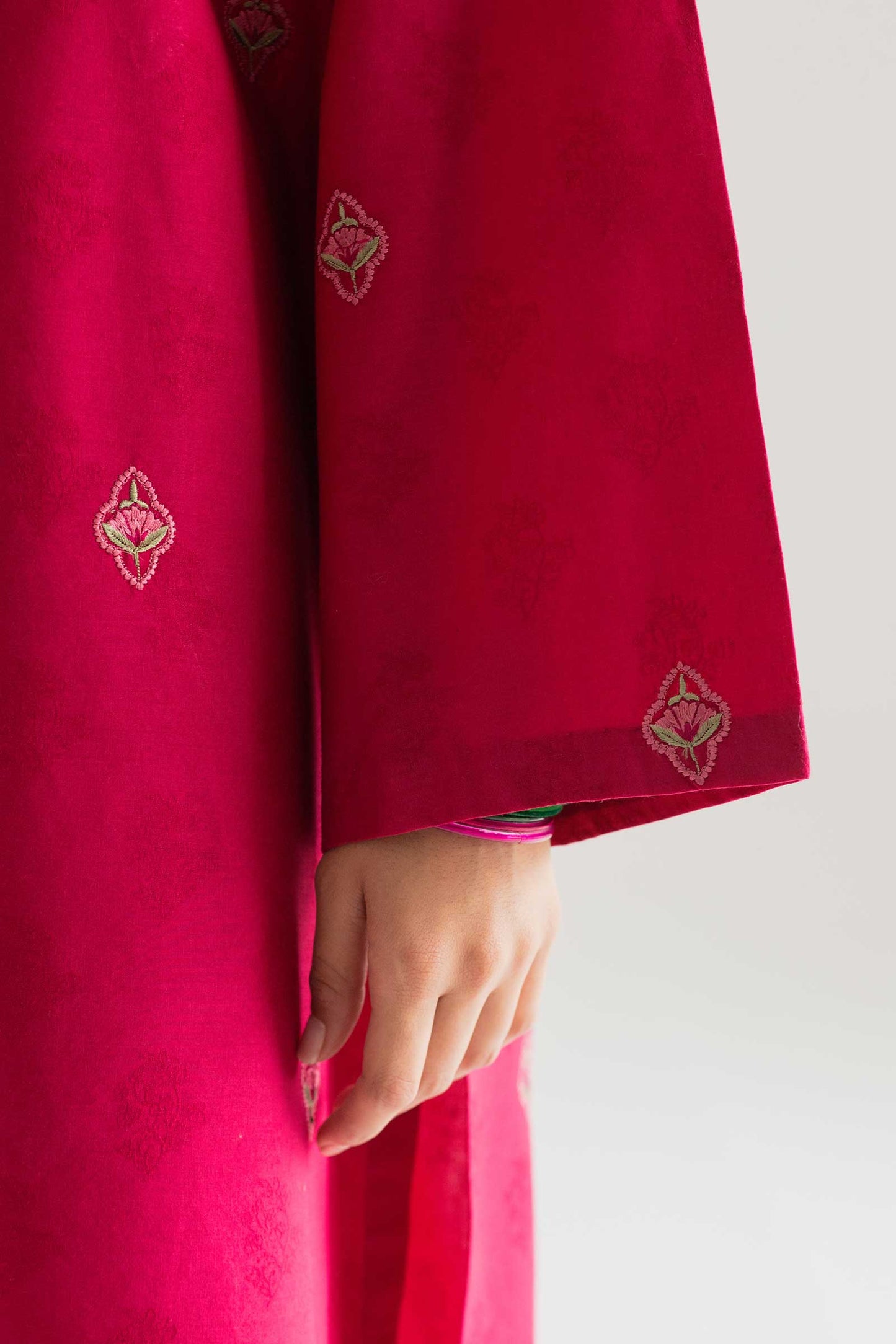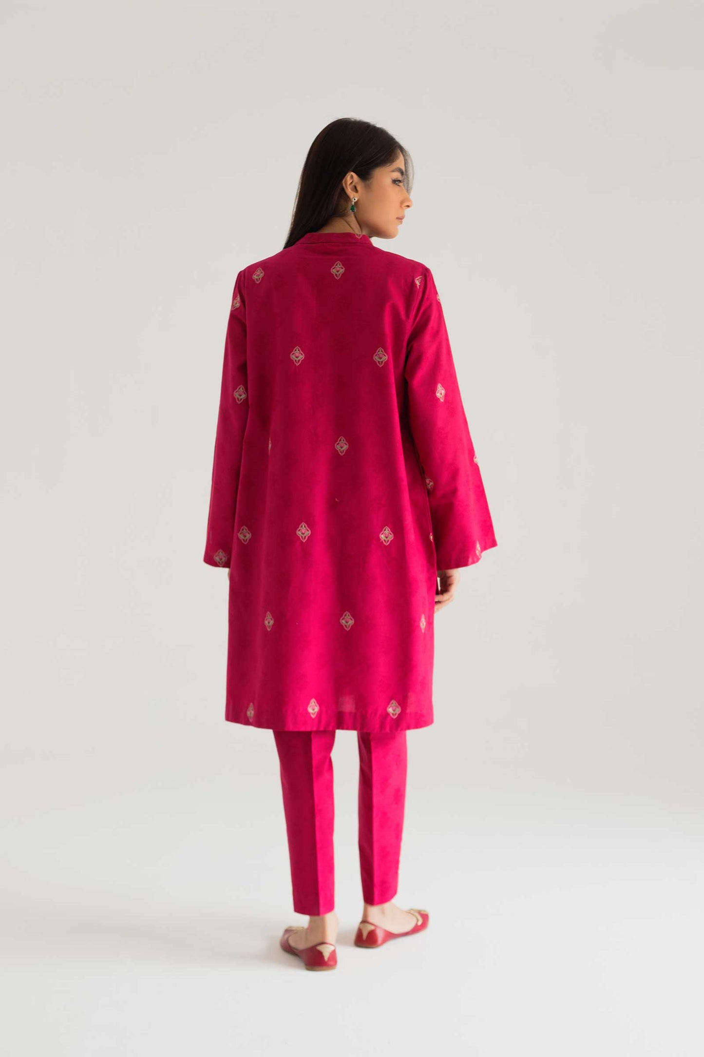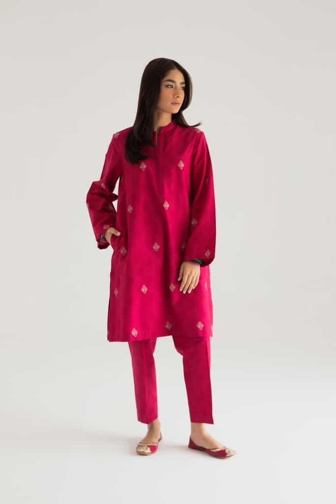 Loose, straight-fit pink kurta with embroidered spray all over. Paired with straight fit pants.