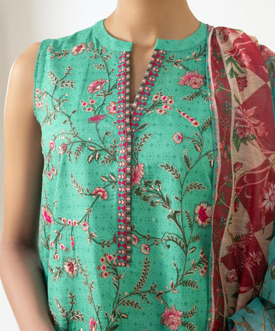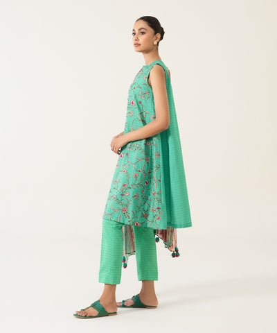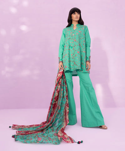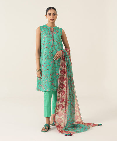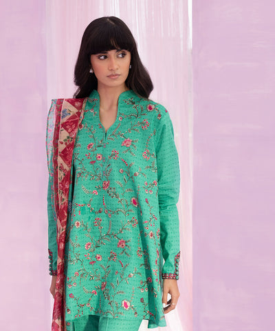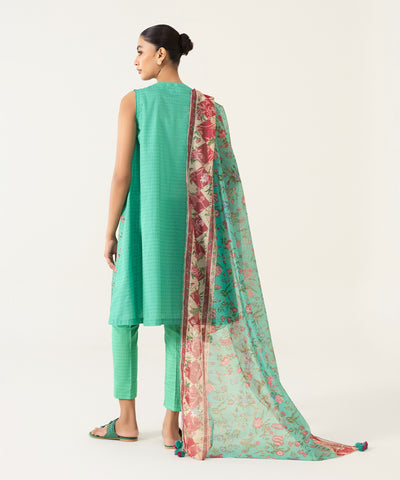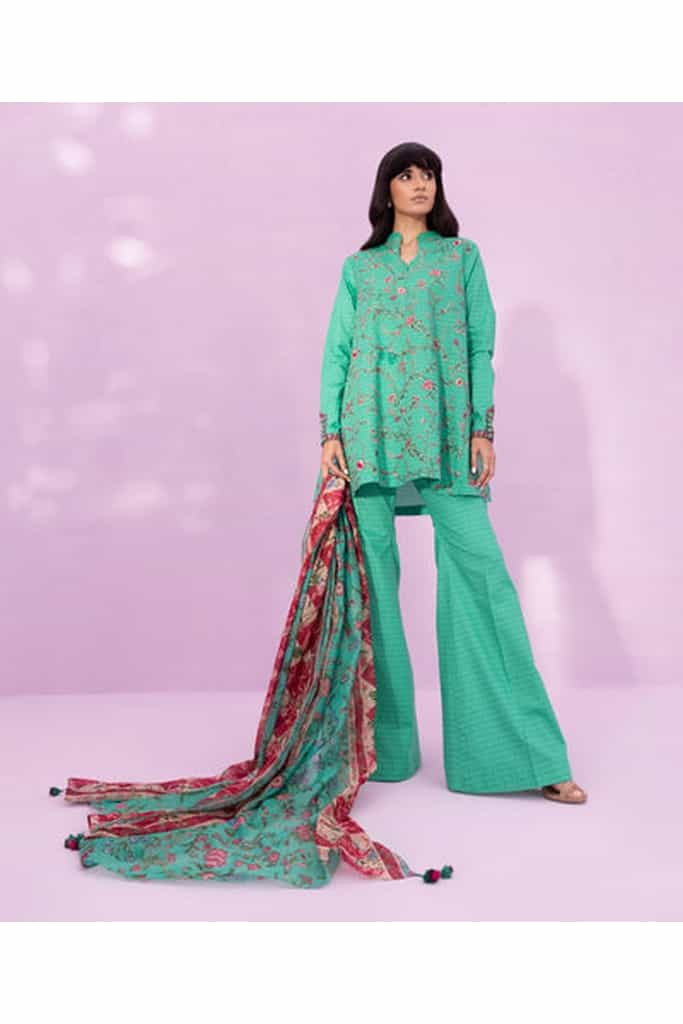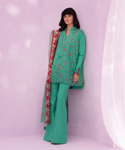 Create a fashion forward statement with our sea green three-piece featuring a manar dupatta.