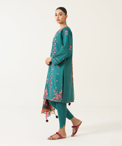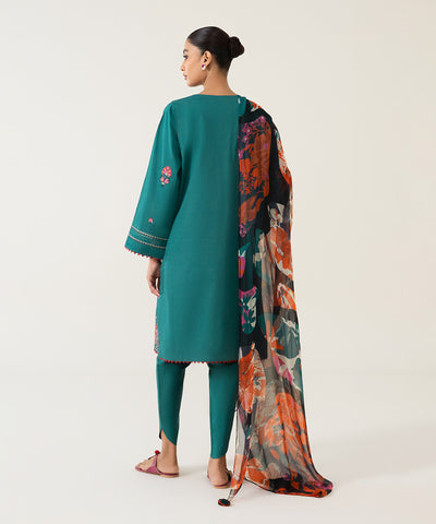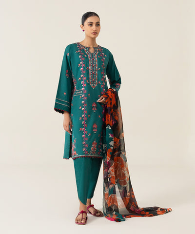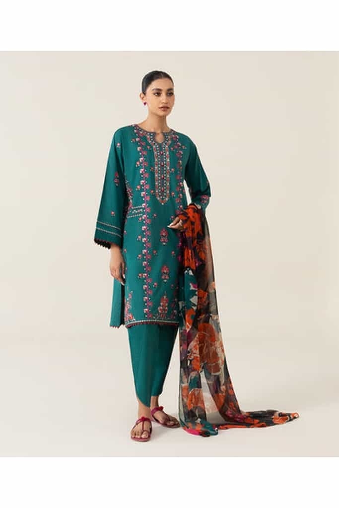 Create a fashion forward statement with our ocean blue three-piece featuring a chiffon dupatta.