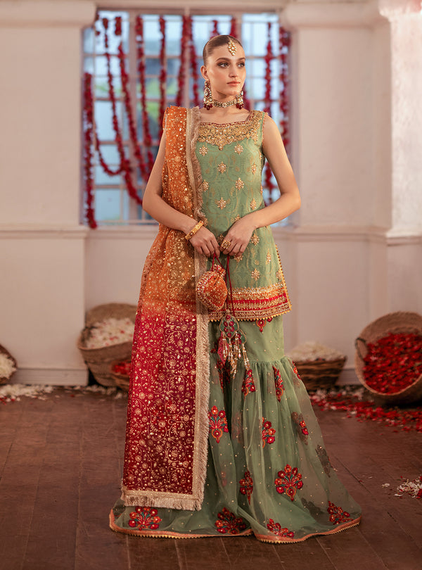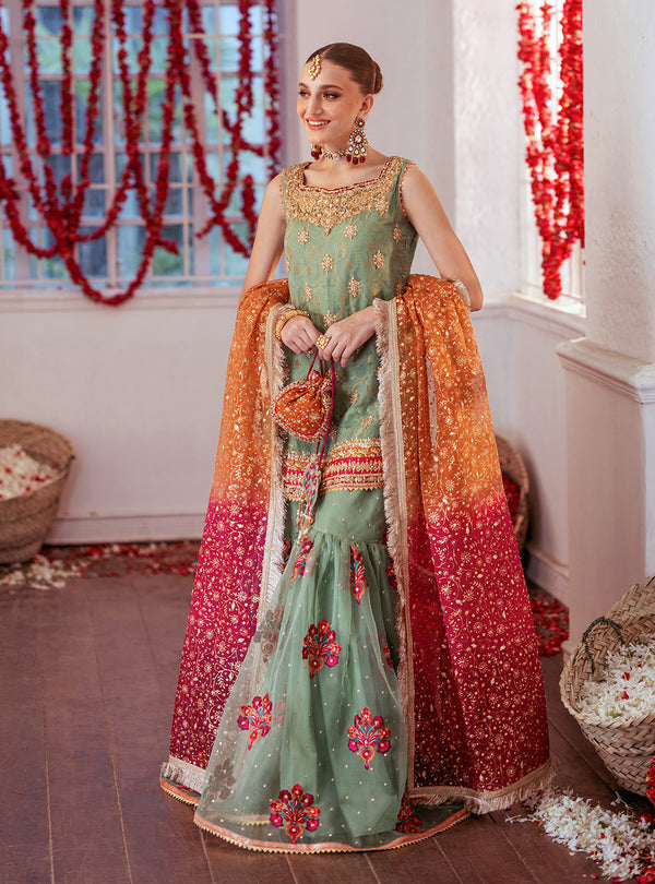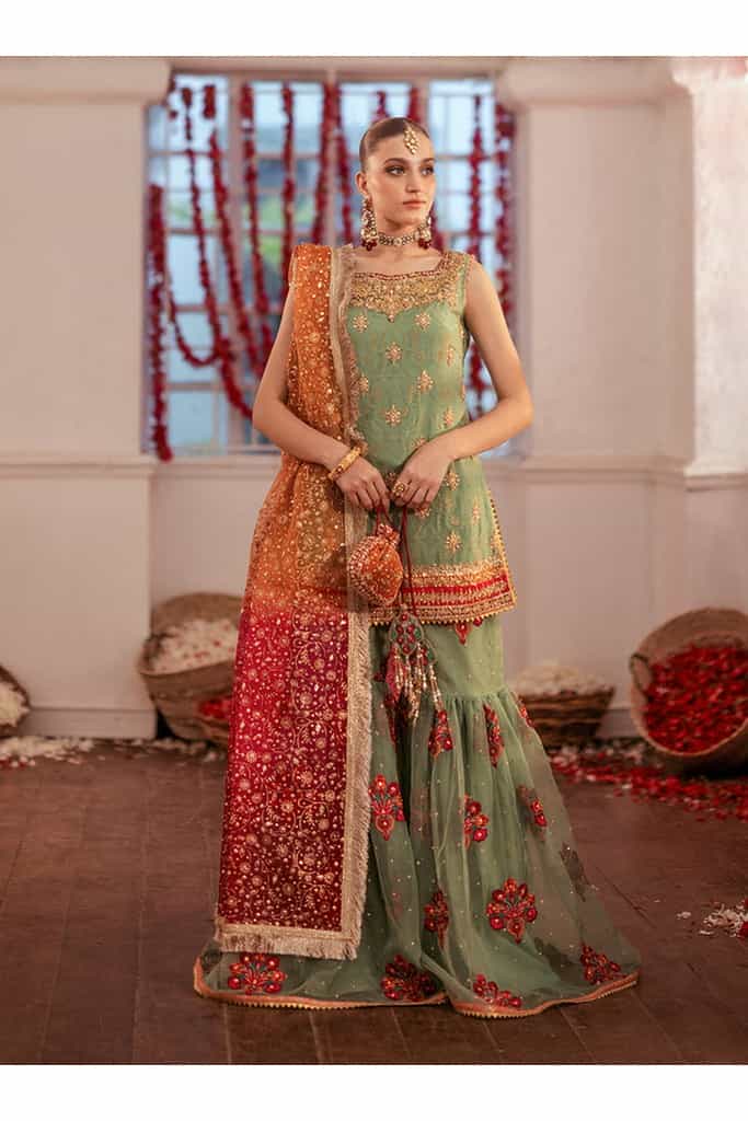 Paired with the shirt is a matching organza embroidery gharara, enhanced with a subtle spray of chan and finished with elegant kingry detailing. Completing this exquisite look is a gradient block print dye dupatta, adorned with beautiful chan work, adding the perfect touch of sophistication and grace. This ensemble is ideal for those looking to make a refined and stylish statement.