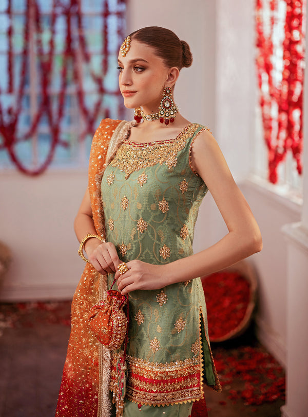 The Beautiful Mint Green Ensemble is a mesmerizing creation, crafted from delicate chunri chiffon. This enchanting shirt is adorned with heavy handwork, featuring embellished boti designs all over the front and hem, showcasing intricate artistry.
