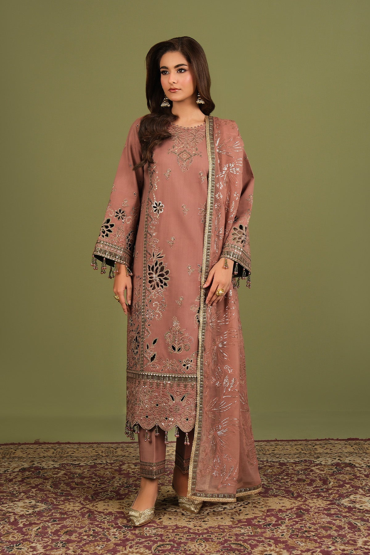 Finely embroidered raw silk composes the shirt, detailed with cutwork and shimmering floral patterns. Ornate borders and bead droplets finish the hem and sleeves, adding a touch of artisanal craftsmanship. Paired with matching dyed raw silk trousers featuring embroidered borders.