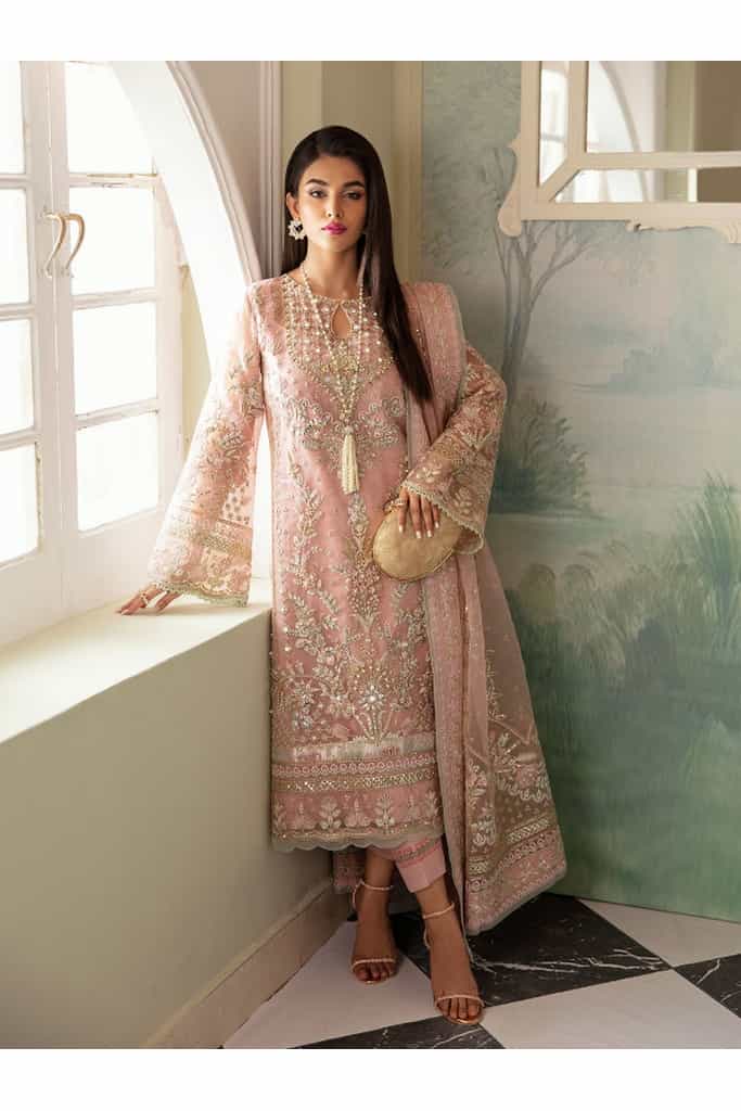 This exquisite ensemble showcases intricate embroidery and handiwork on a soft pastel pink organza fabric. This article captivates with its elegant monotone embroidery adorned with delicate silver panni accents. Every detail has been carefully considered, including the thoughtful sequined embellishments and our signature handwork techniques. We have paired it with a stunning heavily embroidered organza dupatta, featuring extravagant pallus that exude elegance. Additionally, four-sided embroidered & sequined borders adorn the raw silk, further enhancing its splendor.
