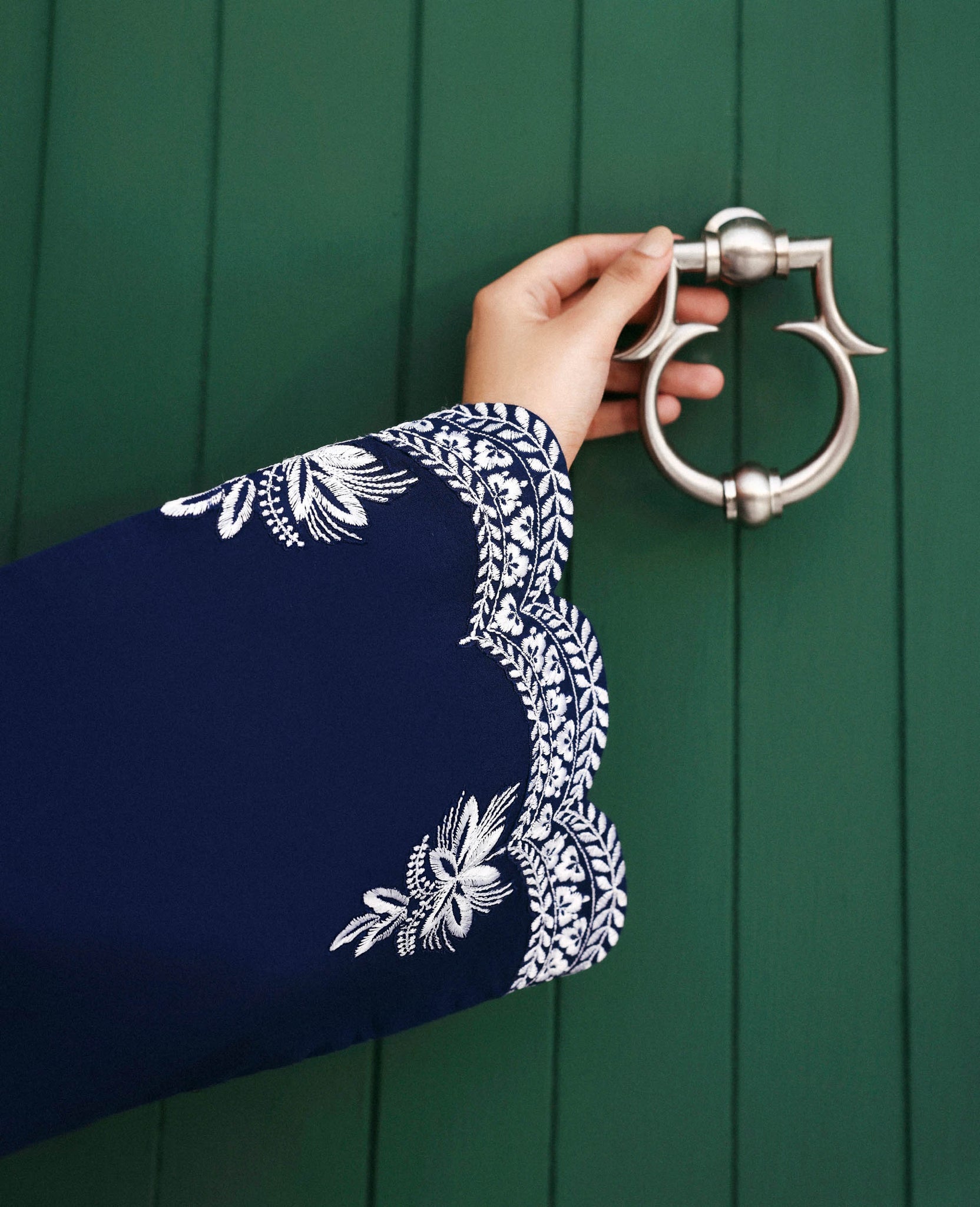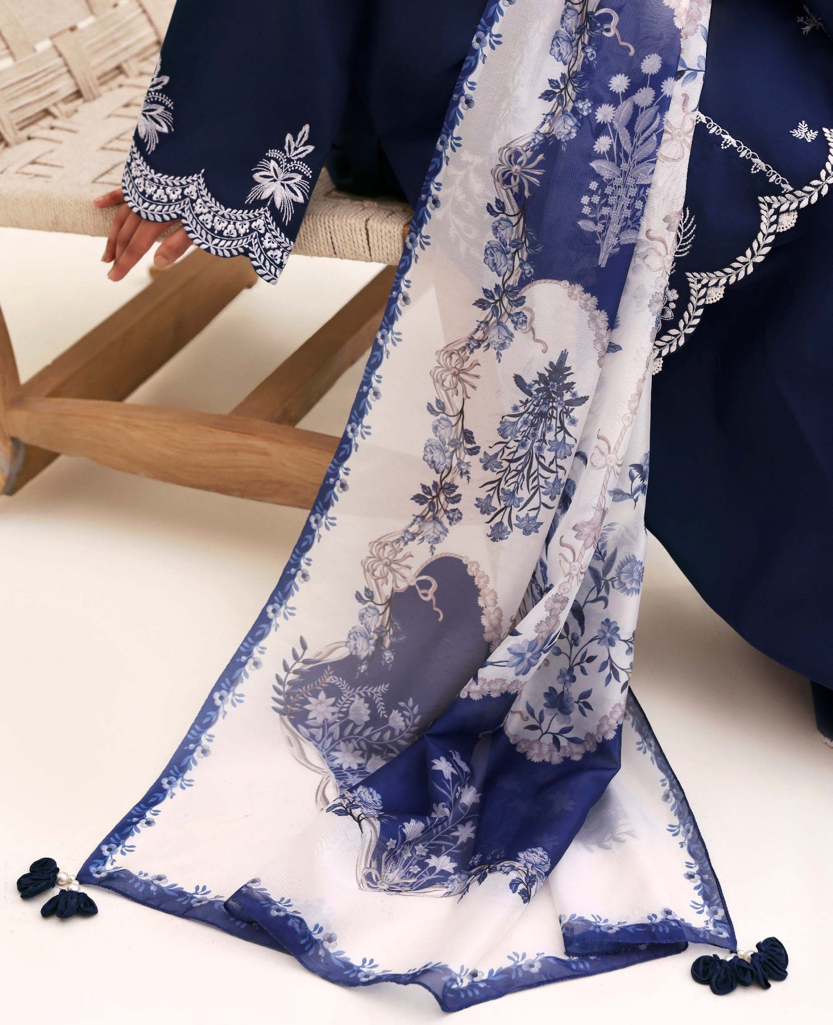 Dahlia features a timeless navy blue hue that embodies both elegance and sophistication. The short-length shirt is beautifully adorned with white-on-blue embroidery and detailed with scalloped sleeves, creating a refined yet modern look. It is paired with a white silk printed dupatta finished with 4-sided tassels and complemented by a classic farshi shalwar. Crafted from premium cambric and silk fabrics, this ensemble perfectly blends traditional charm with contemporary finesse.