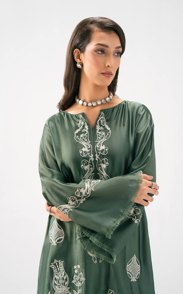 Crafted in sumptuous sheesha silk, this fully embroidered suit is a statement of refined elegance. Paired with loose palazzo pants for a graceful silhouette, the look is completed with a pure organza dupatta, adding a sheer layer of sophistication. Perfect for those who want to embrace effortless luxury with a modern edge!!