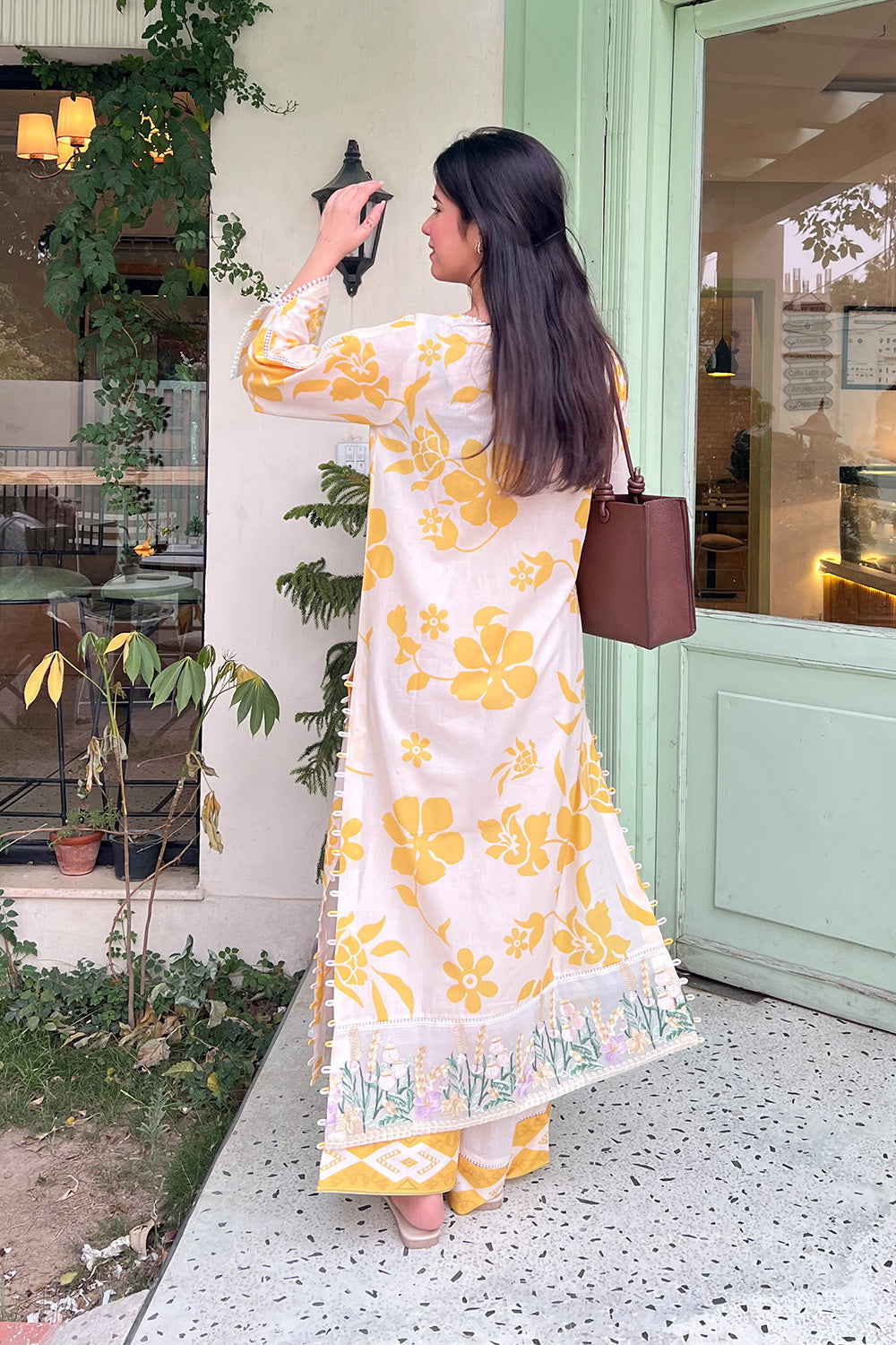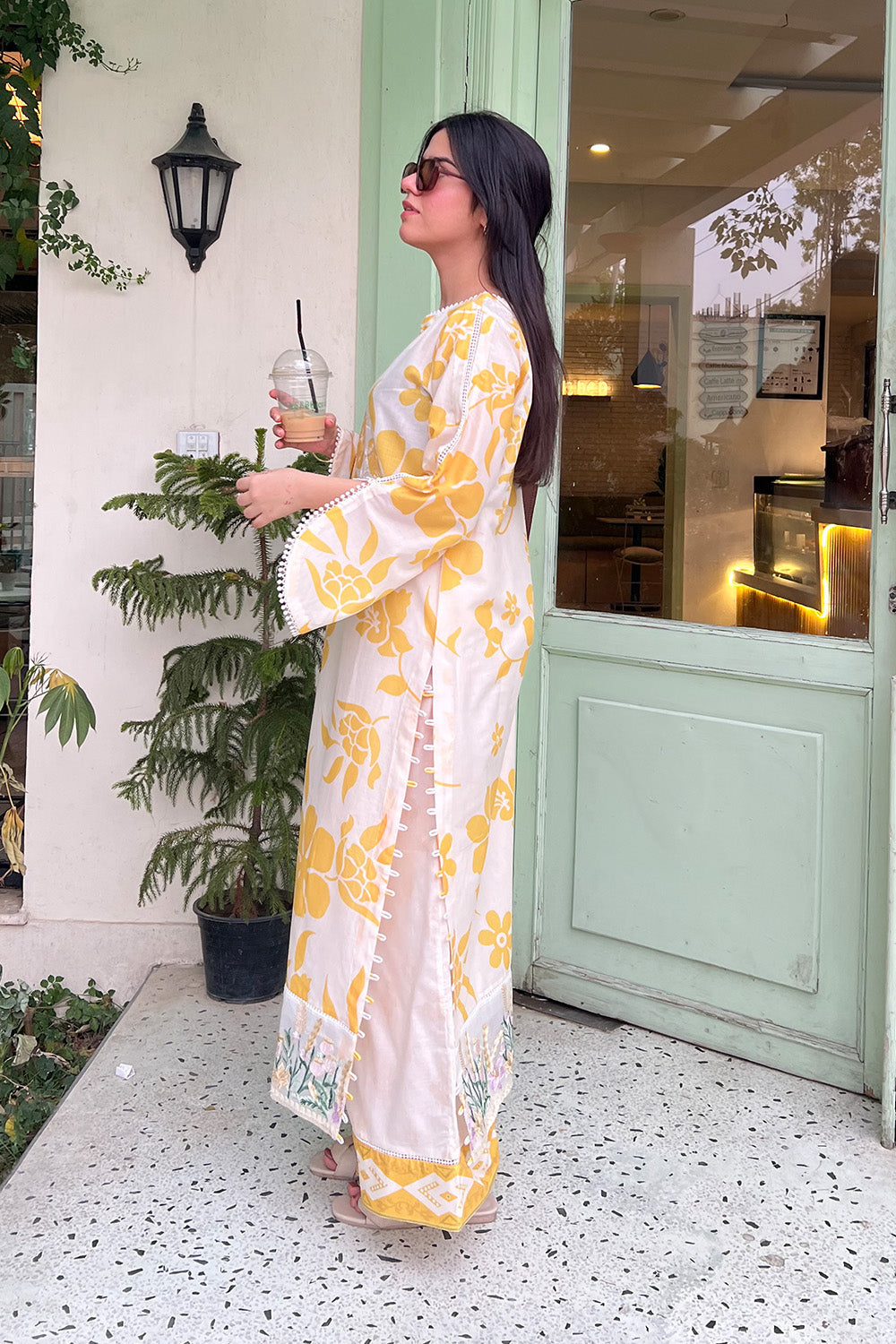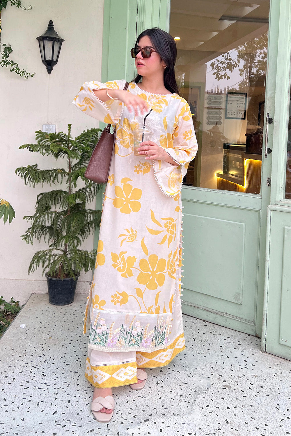 Bask in the soft glow of elegance with this Lemon Icing 2-piece pret set, a refreshing blend of charm and sophistication. The printed lawn shirt features a graceful boat neckline accented with delicate lace, while matching lace on the round sleeves adds a touch of femininity. Side slits are elevated with dainty loop detailing, bringing a playful twist to the classic silhouette. The hem is adorned with vibrant embroidered organza, infusing a pop of color and artisanal detail. Paired with matching printed trousers, this long shirt ensemble is perfect for refined daytime flair or subtle festive grace.