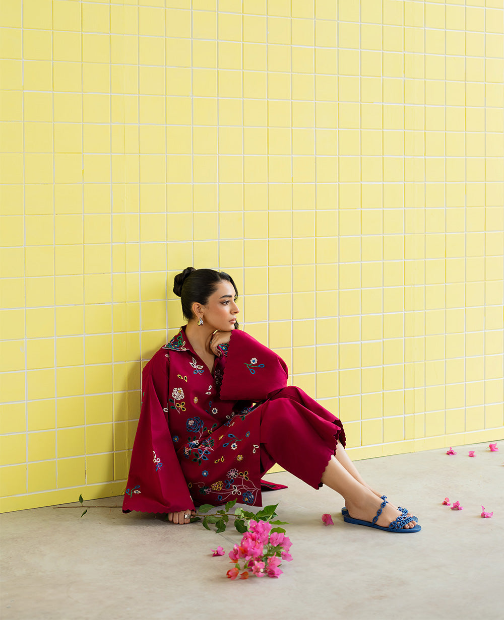 Drenched in the opulence of raspberry wine, this exquisite co-ord set is a celebration of refined craftsmanship and bold expression. Intricately adorned with the delicate French broderie technique, it bursts to life with vibrant accents of bright green, soft pink, pure white, and striking blue. The silhouette is elevated with a modern cutline, while the scalloped trousers add a graceful, feminine finish. A perfect fusion of tradition and trend—designed for the woman who commands attention with quiet elegance.