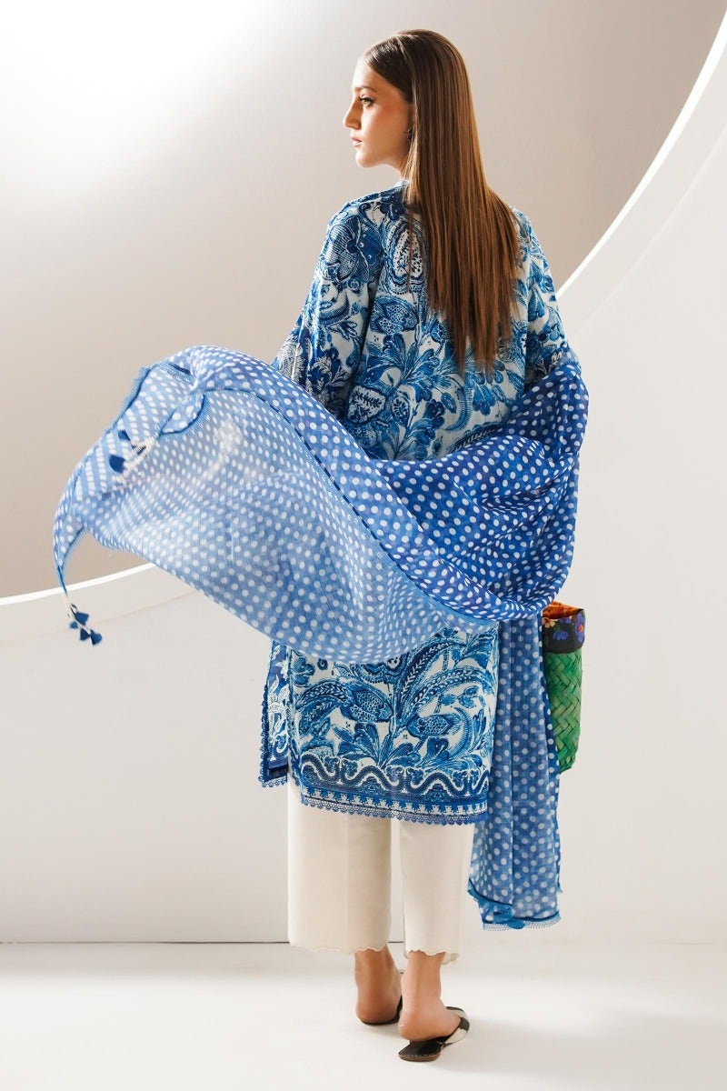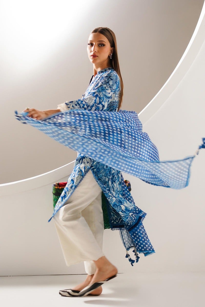 Emotions inspired by nature are meticulously crafted on a diaphanous canvas, resulting in a melodic creation. Fusing in perfect harmony with the ensemble is a polka dot digital printed dupatta in cross slub, completing the look with finesse.