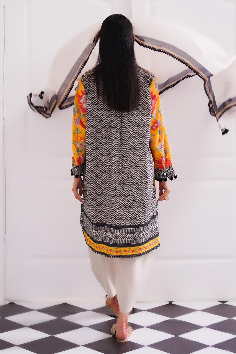 In the sunny embrace of this pineapple yellow lawn shirt, let the bold floral print take you on a journey of pure bliss. Its contrasting cross slub dupatta, will wrap you in warmth and chic charm.