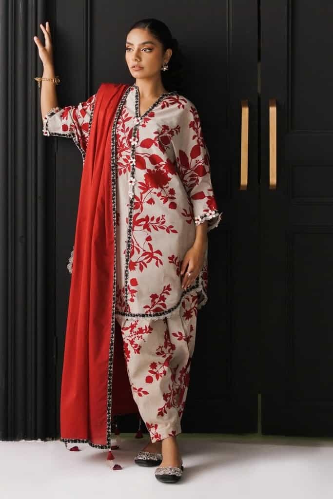 Nestled in the beauty of floral paradise, allow the vibrant print of this lawn set whisk you away to a dreamy escape. Complemented by the rotary printed pants and dyed lawn dupatta, this ensemble is a tribute to the wonders of nature.