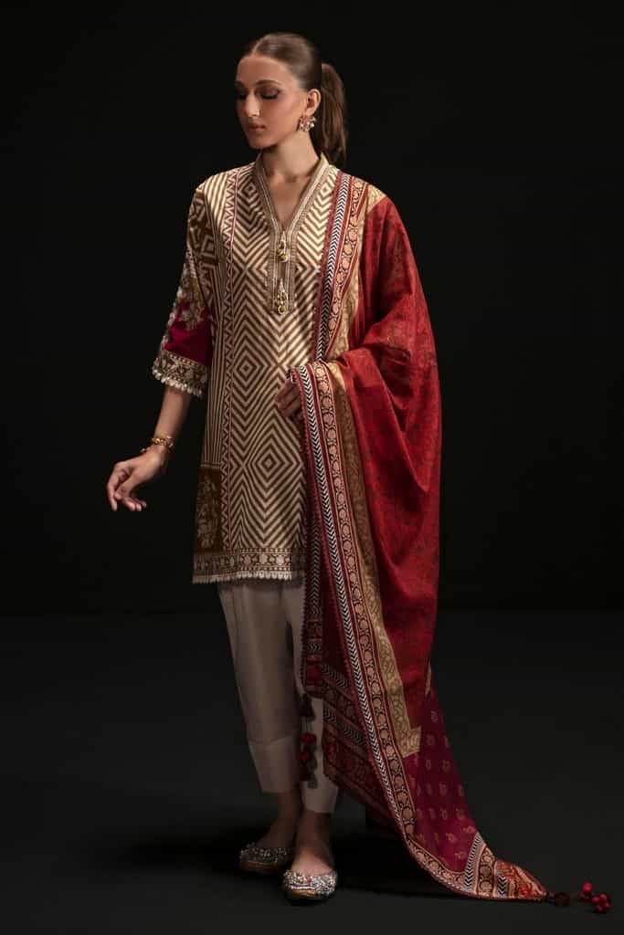 A contemporary take on traditional prints, this geometric F/B printed shirt on airy lawn is beautifully complemented by a Persian rug inspired digital printed dupatta, uniting culture and design.