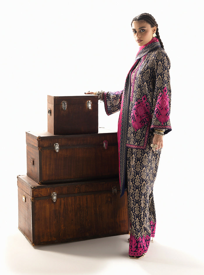 Kesia is a poetic ode to winter elegance, where bold color meets intricate artistry. The luxurious Lenzing Ecovero shawl, drenched in a captivating fuchsia, cascades over a sophisticated Marina Twill ensemble, creating a symphony of patterns in rich navy and soft beige. This design evokes the spirit of vibrant narratives and artistic expression, with the shawl's intense hue providing a striking counterpoint to the suit's detailed motifs. It’s an ensemble for those who wish to tell a story with their style.