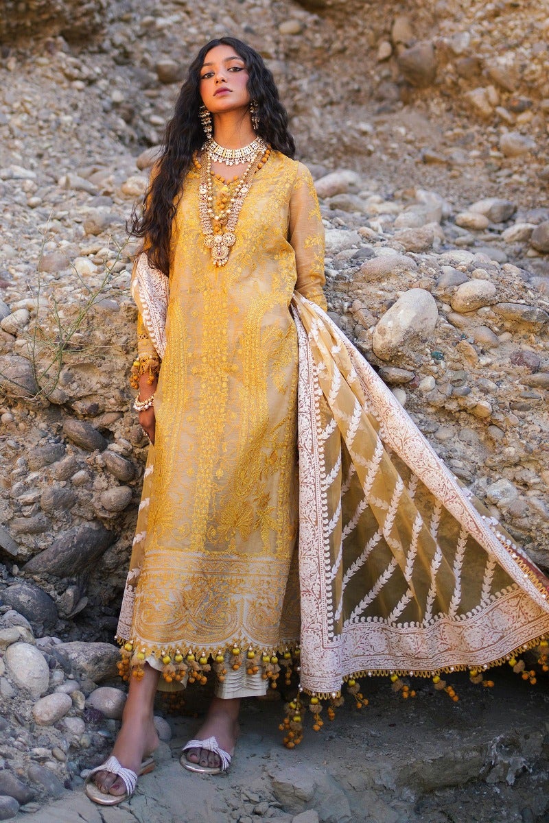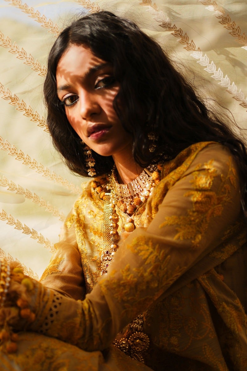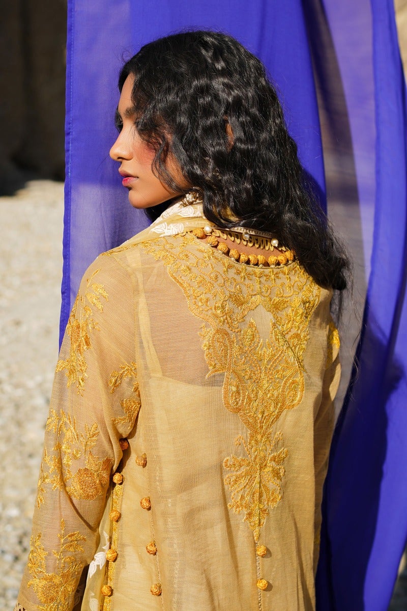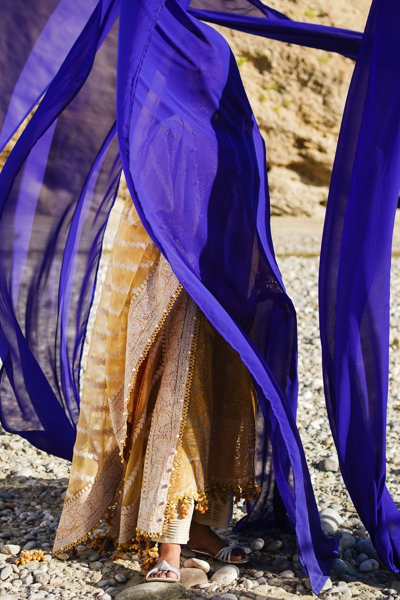 Reflecting hues of daylight and the gleaming santorini sun gives life to the floral motifs on a woven net canvas. Paired along is a dreamy flock printed organza dupatta, giving it the perfect allure.