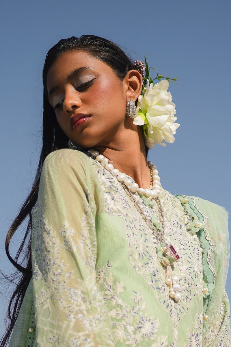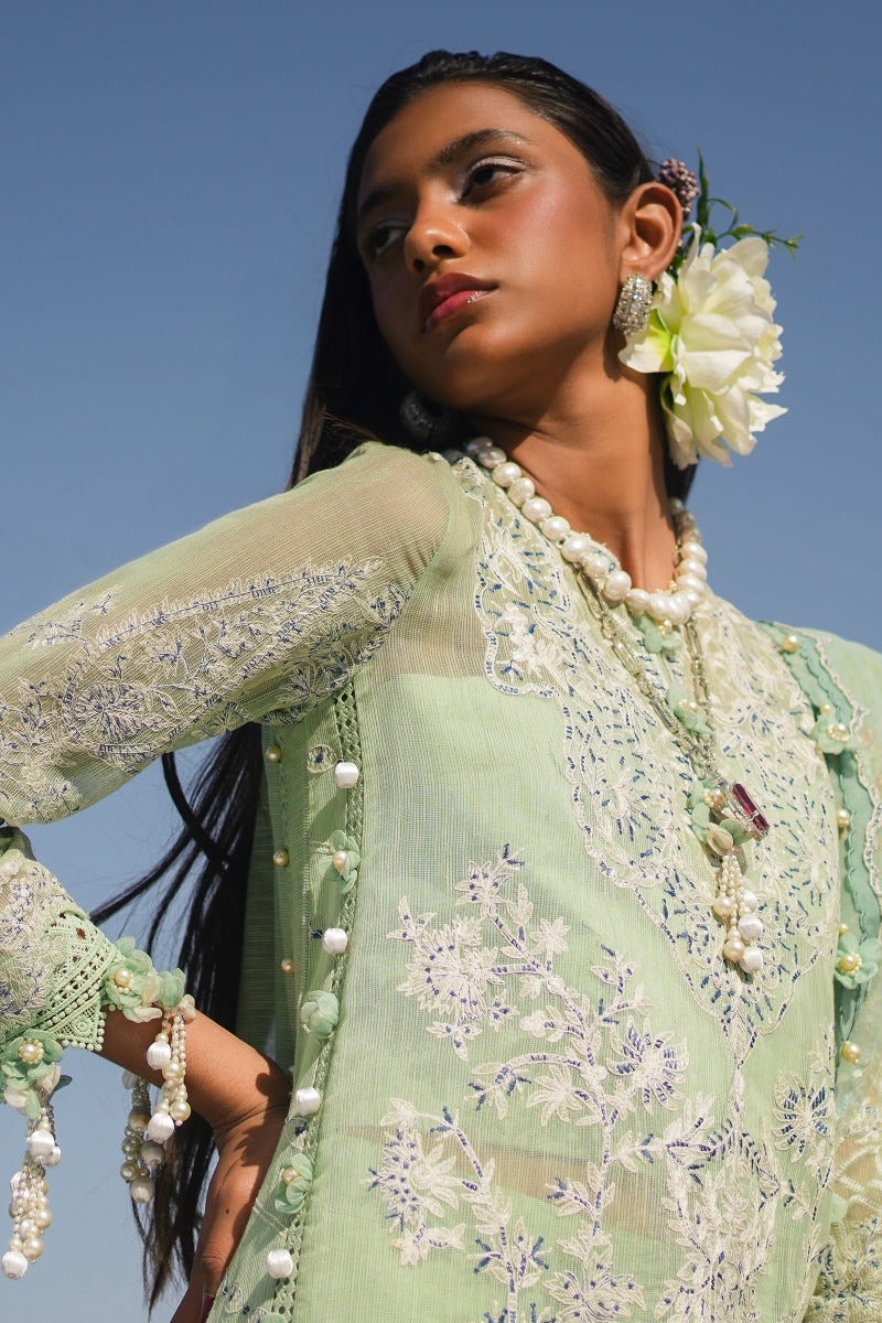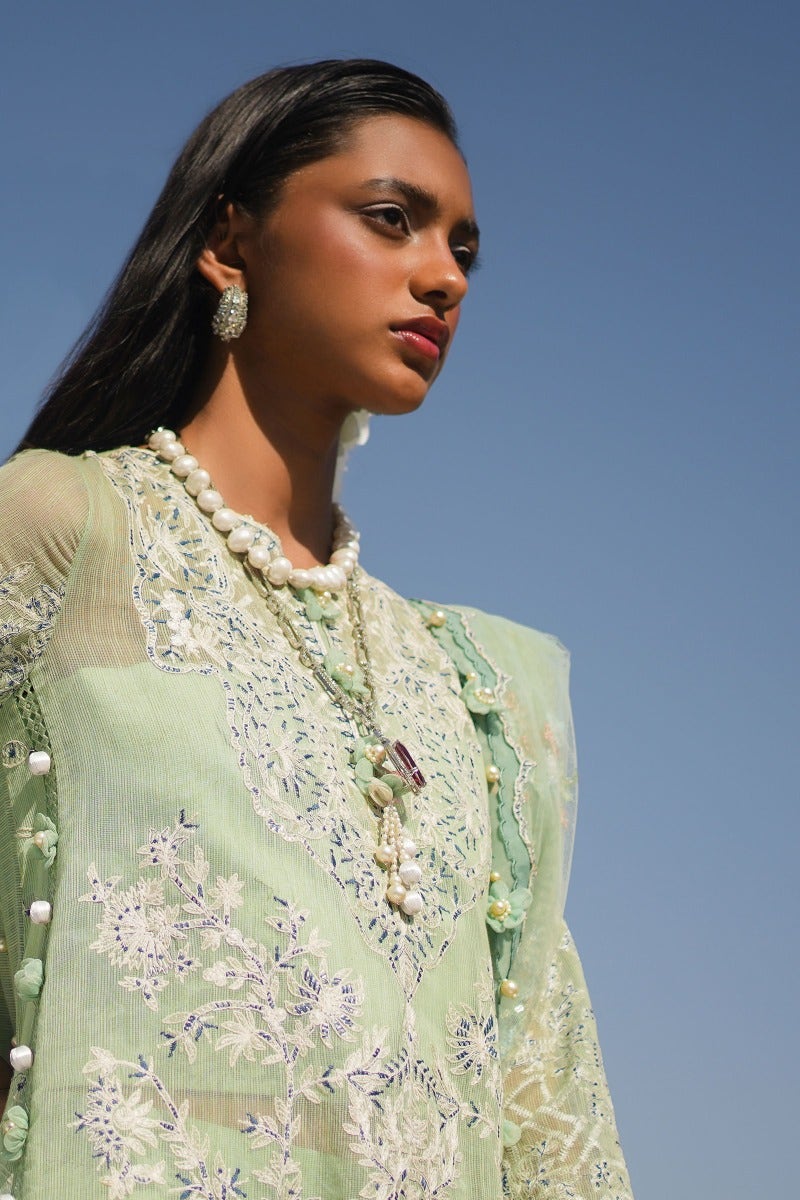 Revisiting classic silhouette in new fangled perspective on an artfully layered apple green canvas. A similar hued dupatta with melange of floral artistry gives it modernly grace.