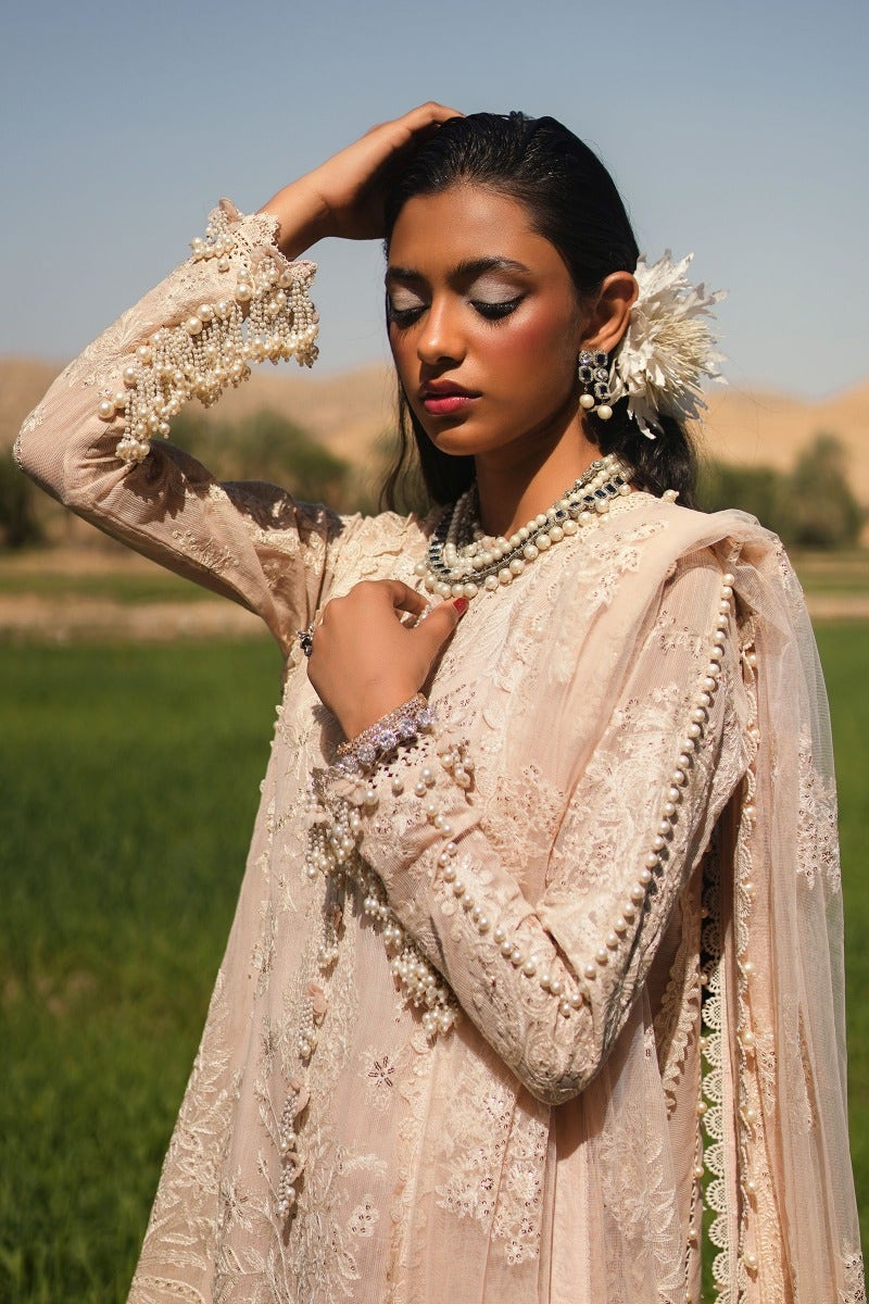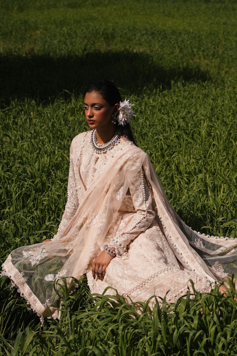 Traditional detailing and volumes of elegance collide with precision to create a resplendent pastel pink hued ensemble.