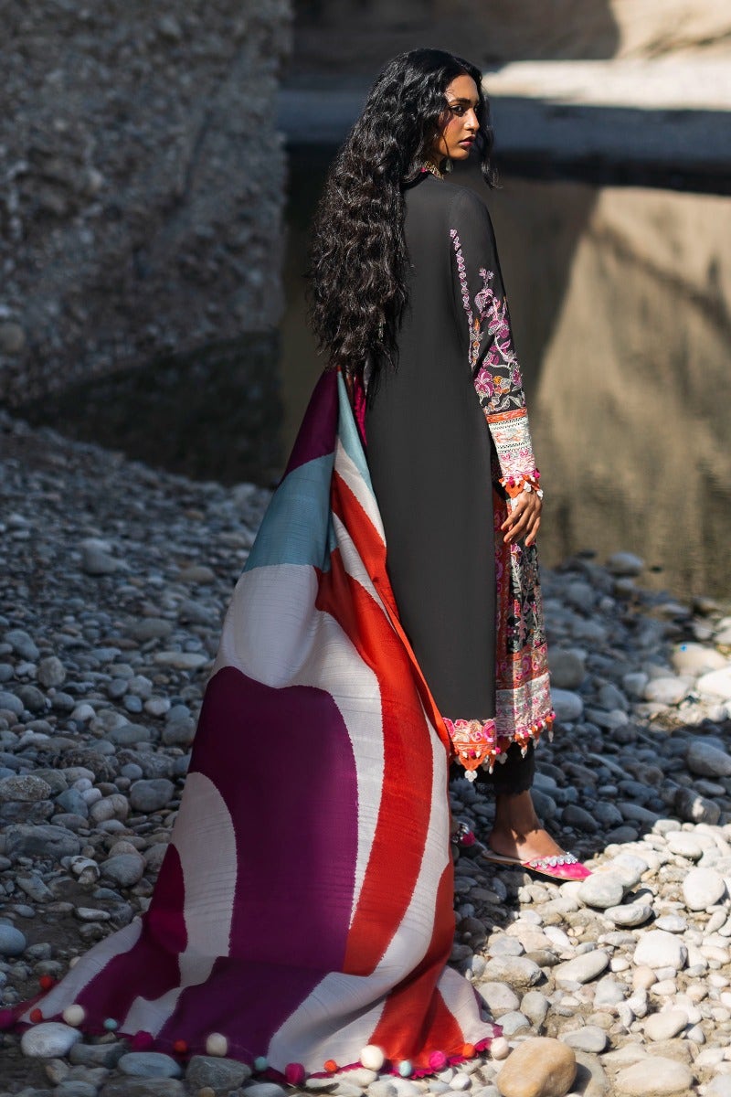 Vivacious embroideries inspired by floral blooms of nature dancing on an onyx surface. Enhanced with a digital, abstract printed dupatta.
